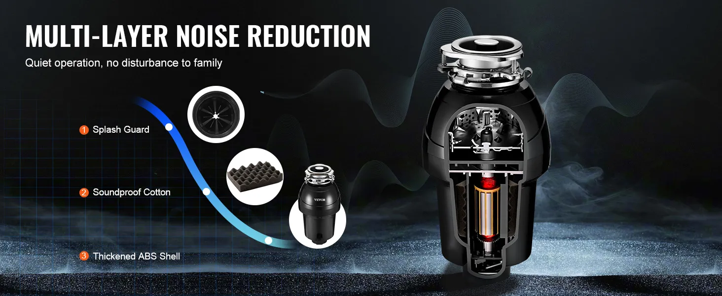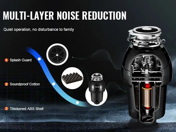 Multi-Layer Noise Reduction: Enjoy a quieter grinding experience with this kitchen sink disposal, featuring 3 layers of noise reduction—soundproof cotton, splash guard, and a thick ABS shell—to minimize disturbance and ensure peaceful operation.