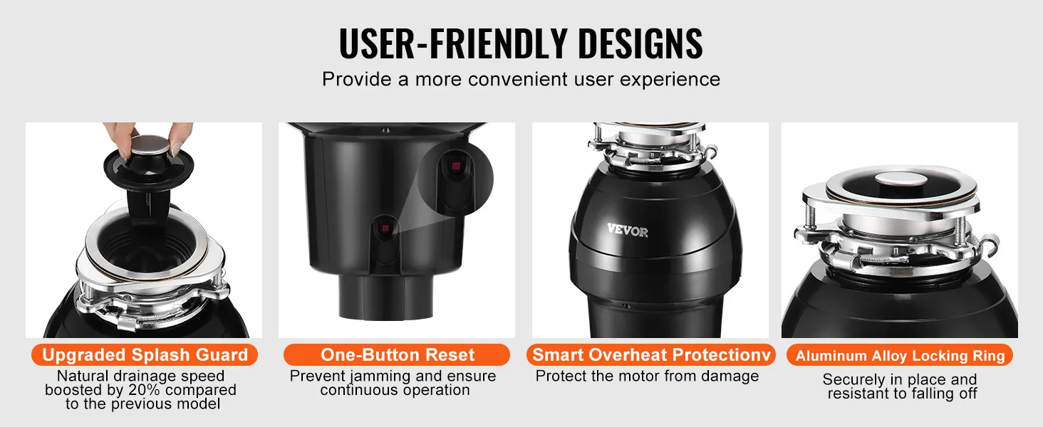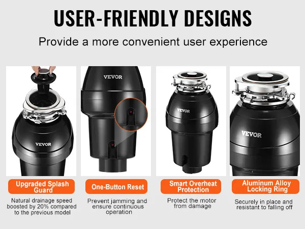 Experience enhanced convenience with thoughtful features. The manual reset button prevents jamming; smart overheat protection safeguard the motor from damage; upgraded splash guard effectively reduces splashing, keeping your kitchen clean while efficiently handling food waste.