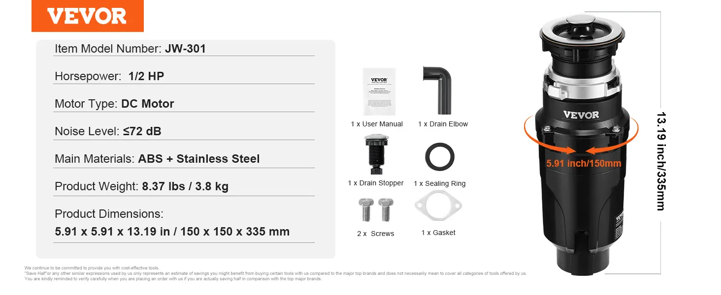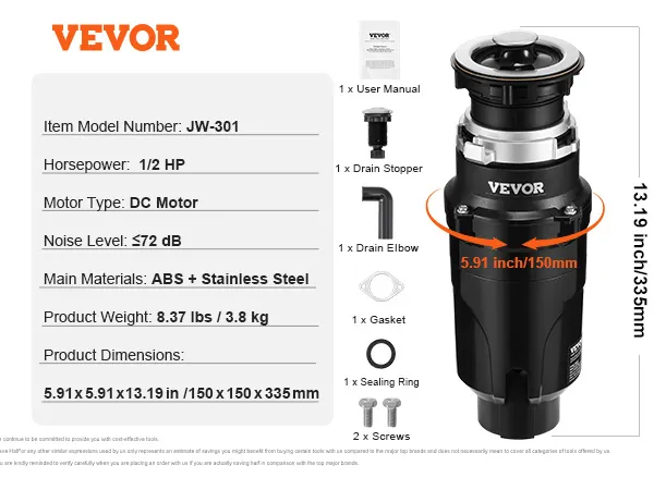 Powerful Grinding, Faster Disposal: Equipped with a 1/2 HP DC motor running at 3820 RPM, this garbage disposer delivers stable, powerful grinding to quickly break down food scraps, reducing the risk of drain clogs and boosting efficiency.