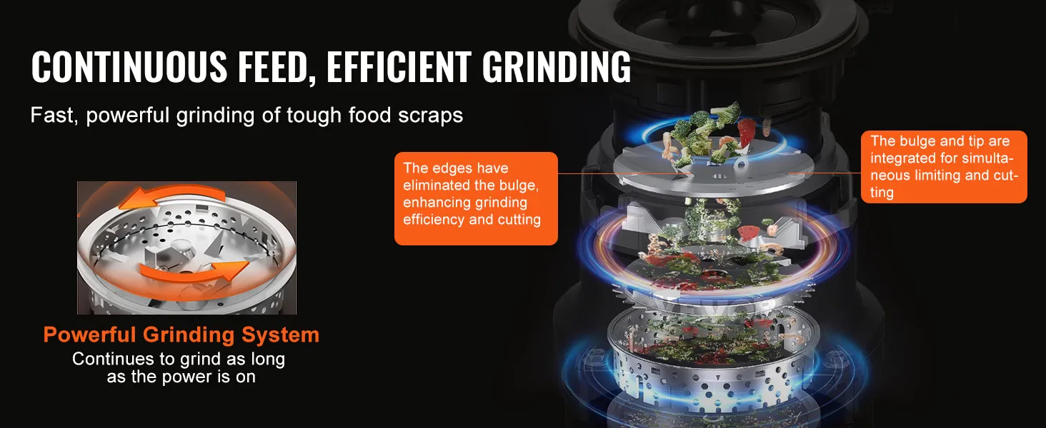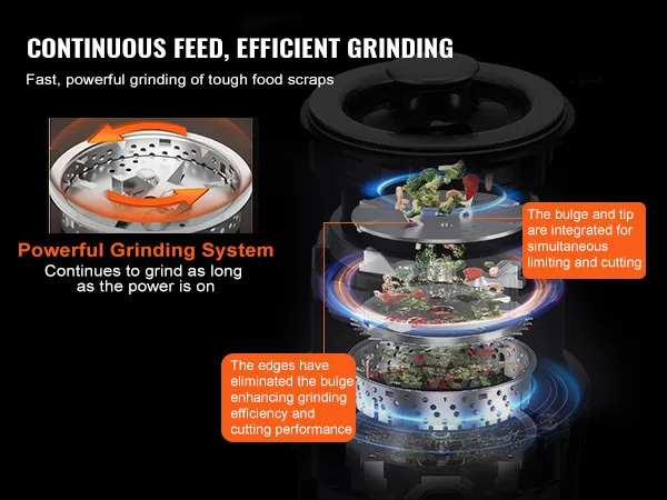 Continuous Feed: This kitchen sink disposal supports continuous feed with multi-stage grinding to effectively handle various kitchen waste. Effortlessly crushes vegetable peels, bones, fruit pits, and more, minimizing clogging for smoother operation.