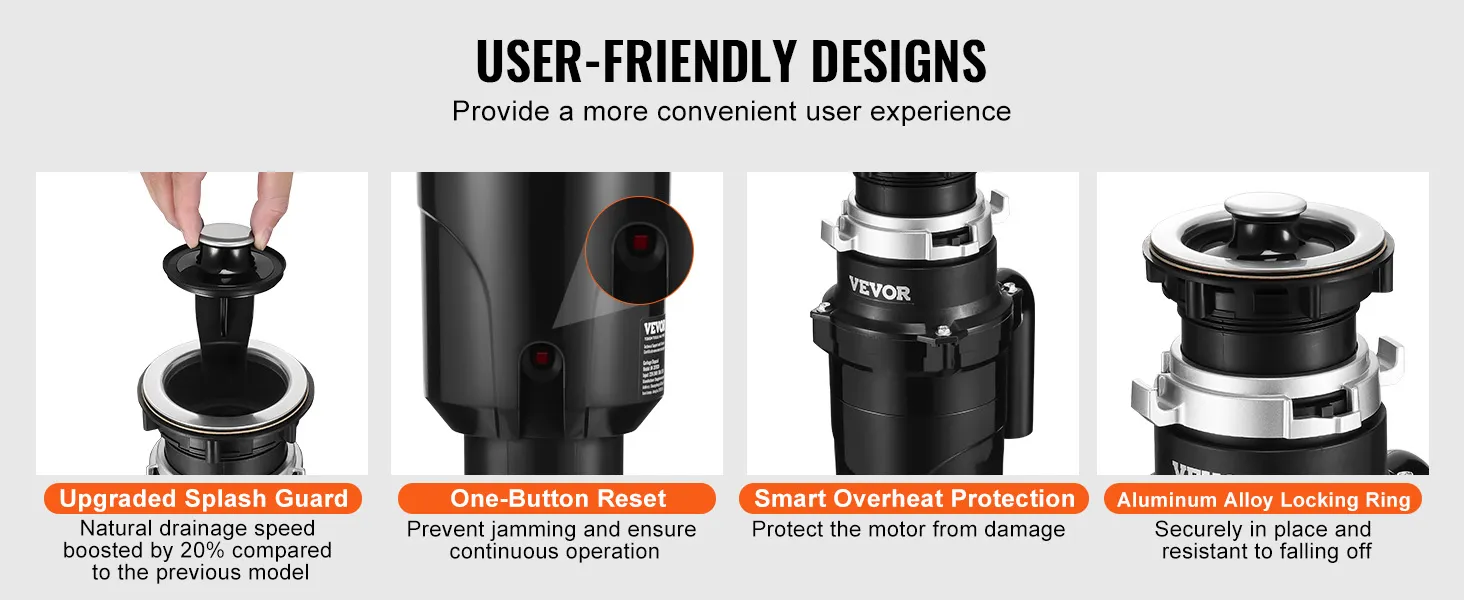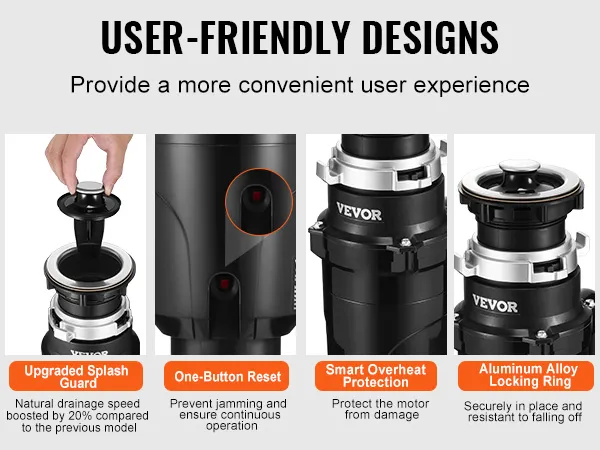 Experience enhanced convenience with thoughtful features. The manual reset button prevents jamming; smart overheat protection safeguard the motor from damage; upgraded splash guard effectively reduces splashing, keeping your kitchen clean while efficiently handling food waste.