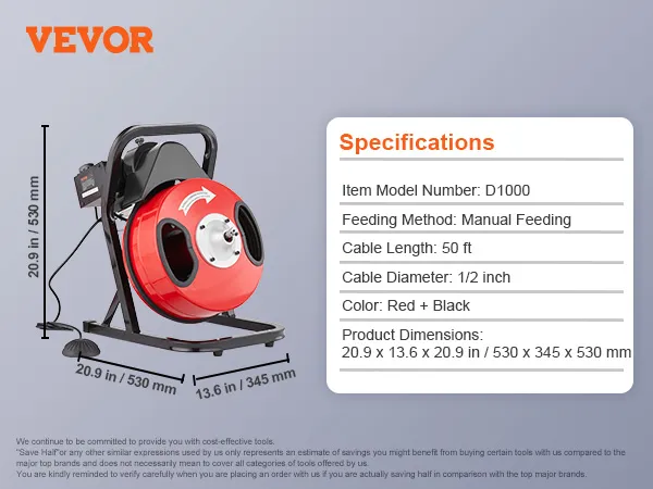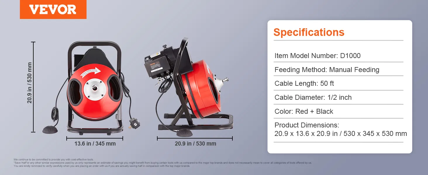 Are you tired of clogged drainage pipes, expensive plumbing services, and incomplete unclogging? Say bye to unpleasant smells and trouble maintenance! Let VEVOR electric drain cleaning machine with 50 FT x 1/2 In solid core cable solve all blockage problems in one go without any worries!