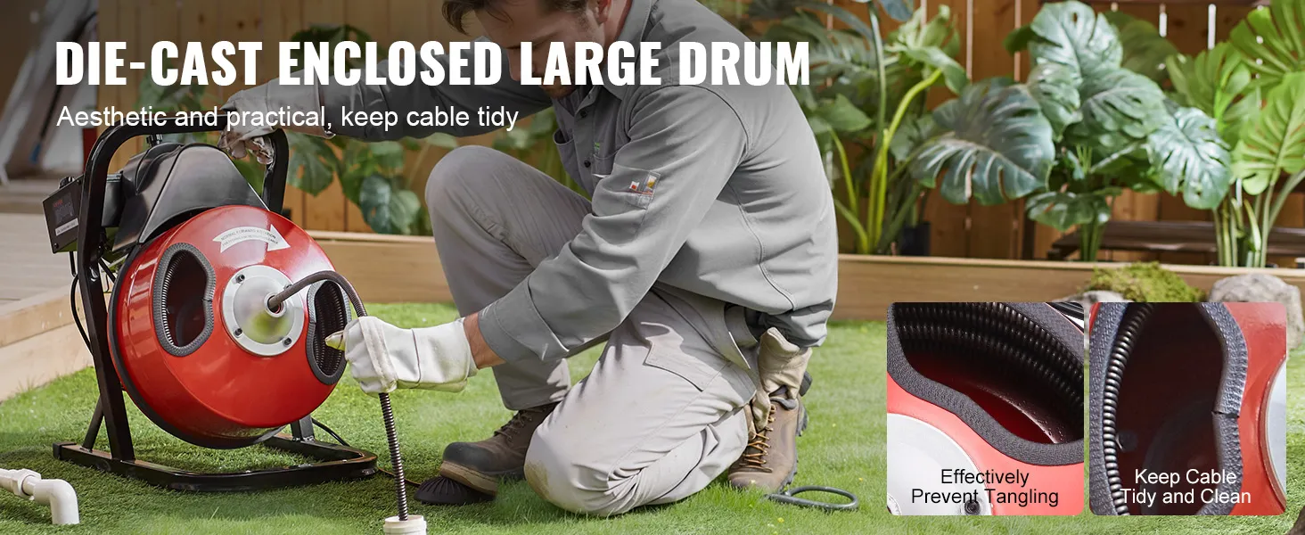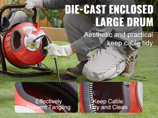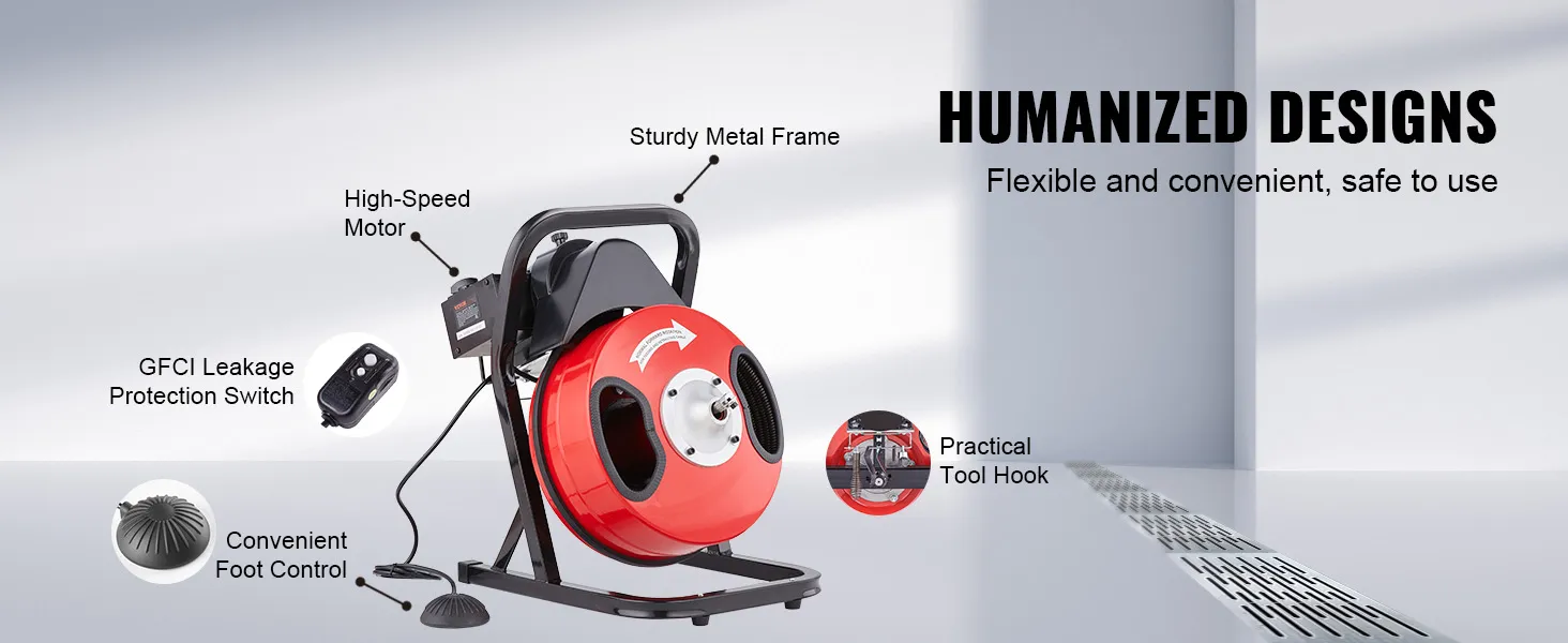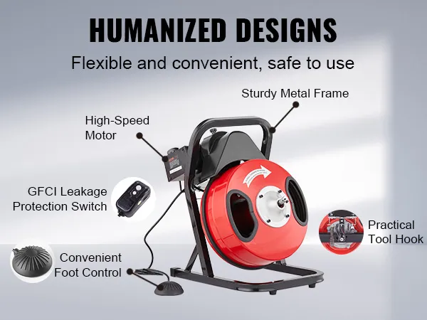 High Durability and Security: Our powerful sewer drain auger features a semi-enclosed metal drum that allows easy observation of the remaining cable length. It also includes a GFCI switch for safety and tool hooks for the cutter's convenient storage