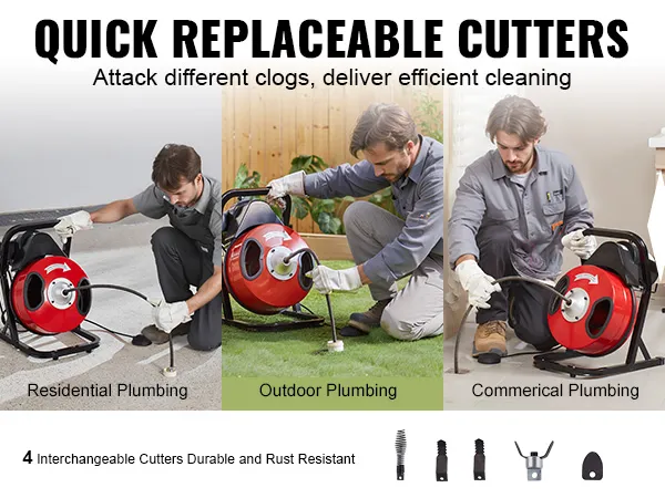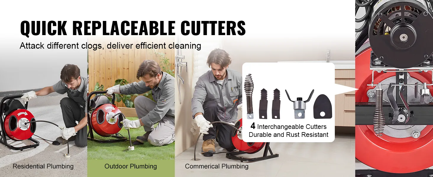With 4 quick-change cutters included, this sewer machine excels in clearing various blockages, making it ideal for professional drain cleaning tasks. From unclogging toilets to sinks and floor drains, it offers versatile applications in homes, offices, and public spaces.