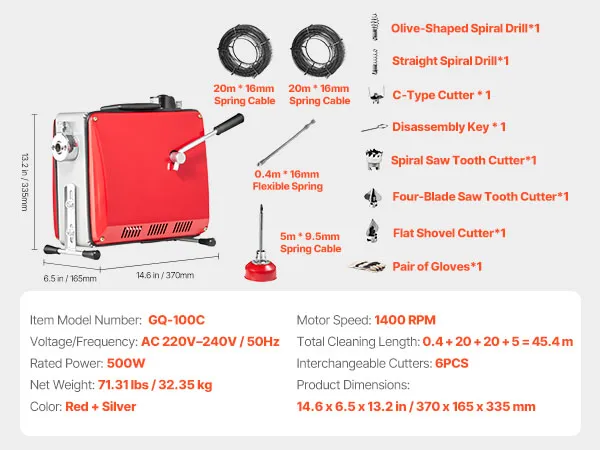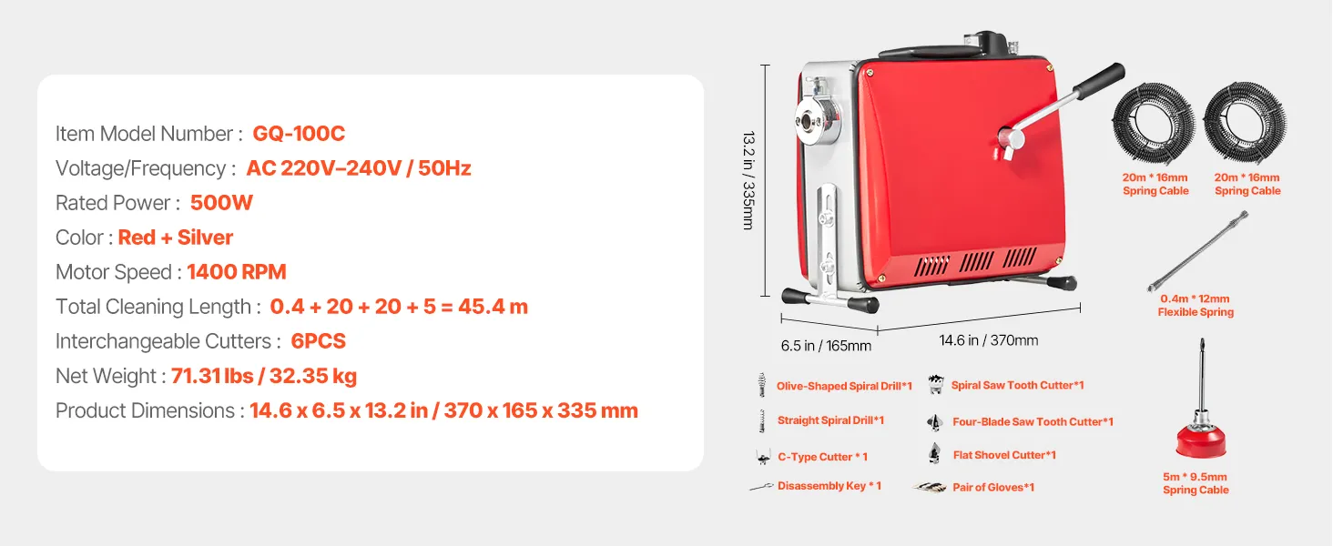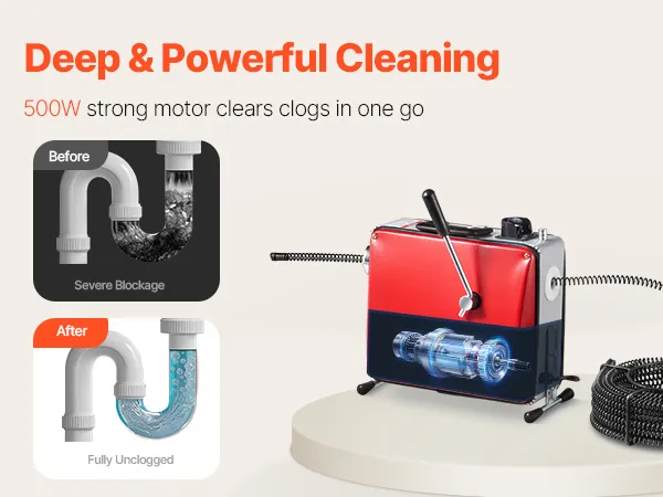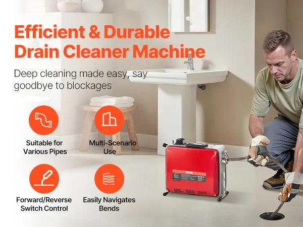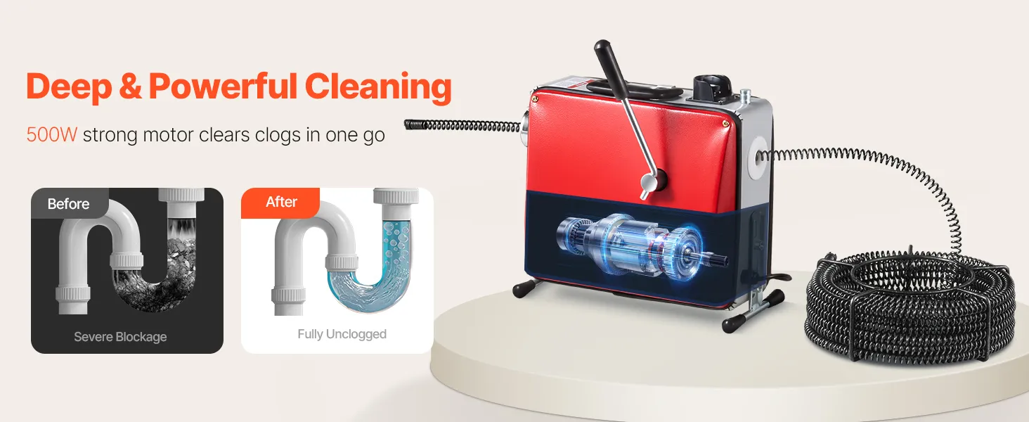 Efficiënte verstoppingsverwijdering: Aangedreven door een 500W-motor met 1400 tpm, levert de VEVOR afvoerontstopper krachtige prestaties voor een grondige en efficiënte reiniging. De vooruit-/achteruitbediening maakt het snoerbeheer eenvoudiger.