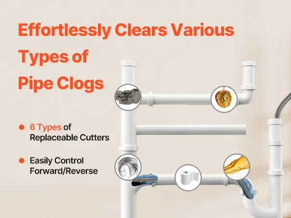 6 verwisselbare snijkoppen: Uitgerust met een veelzijdige set reinigingskoppen die eenvoudig verwisselbaar zijn om diverse soorten verstoppingen te verhelpen. Van kleine, alledaagse verstoppingen tot hardnekkige verstoppingen, onze ontstoppingsmachine verhelpt ze snel en efficiënt.