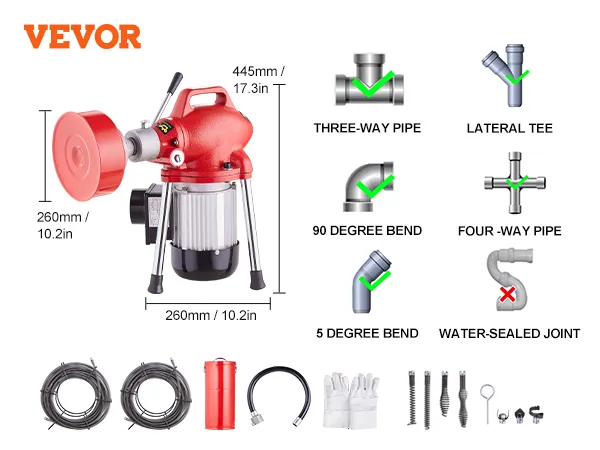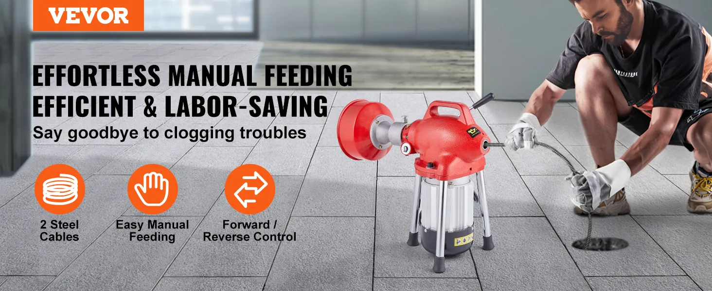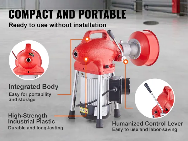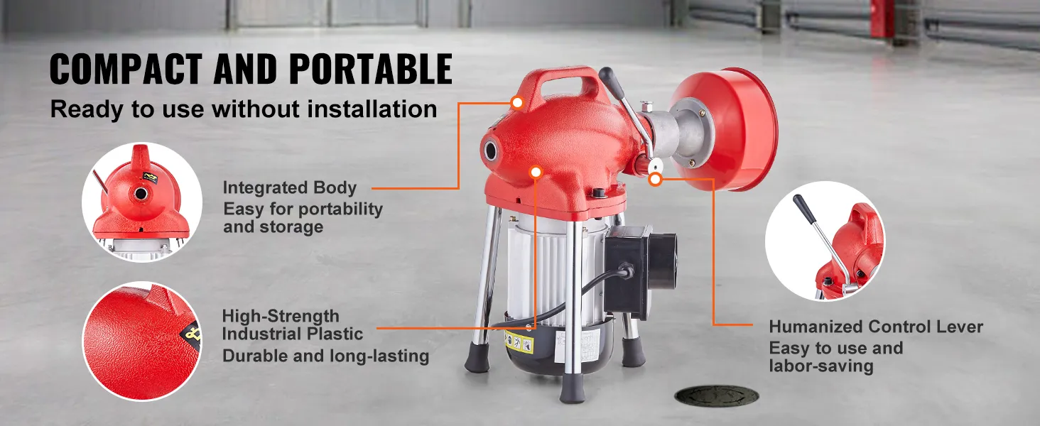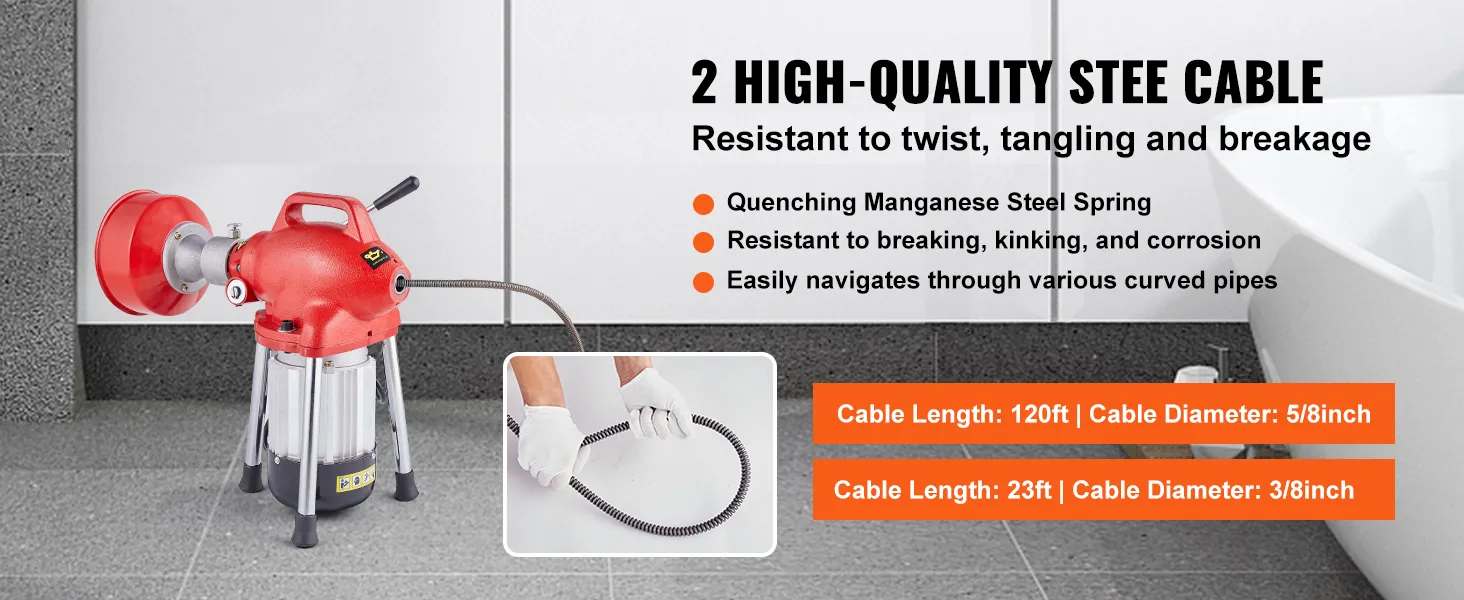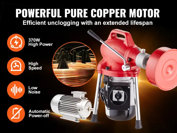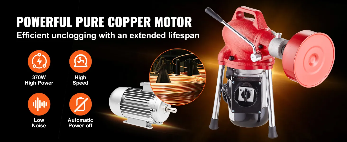Onze pijpreinigingskabel is uitgerust met een motor van 370 W en werkt op hoge snelheid. De koperdraadmotor zorgt voor uitstekende geleiding, minimale weerstand en uitstekende efficiëntie, waardoor hardnekkige verstoppingen gemakkelijk worden geëlimineerd.