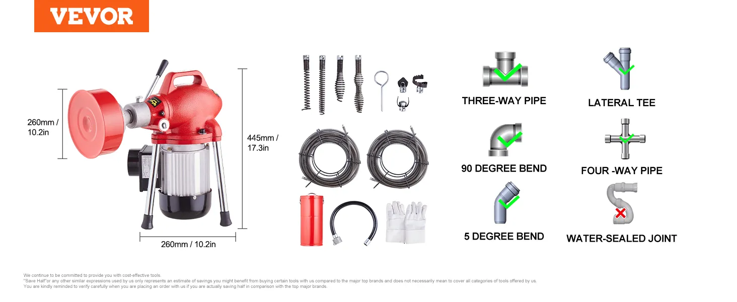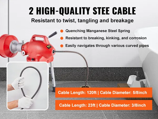 Hoogwaardige staalkabels: de VEVOR pijpreinigingsmachine wordt geleverd met 2 duurzame 65Mn staalkabels: 120ft x 5/8in / 36,6m x 16mm en 23ft x 3/8in / 7m x 9,5mm, verwerkt met oppervlakteharding, om breuk, torsie en corrosie te weerstaan . Ideaal voor buizen van 1,6 tot 4 inch / 4 tot 10 cm.