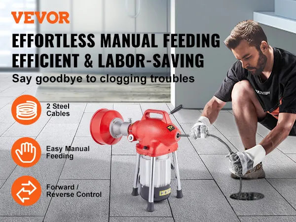 Bestrijd hardnekkige klompen: Onze afvoerreiniger is voorzien van een handmatig voercontrolesysteem waarmee u de voersnelheid en -kracht handmatig kunt regelen. Dankzij de CW/CCW-bediening wordt het hanteren van de kabel eenvoudiger en wordt een efficiënte reiniging gegarandeerd.