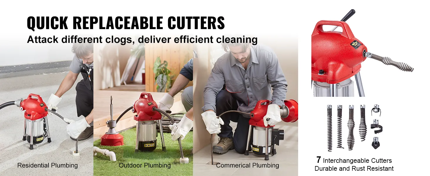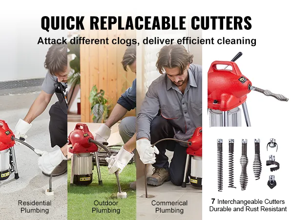 7 verwisselbare snijgereedschappen: de elektrische leidingreinigingskabel heeft 7 snel verwisselbare snijgereedschappen die perfect zijn voor het opruimen van verstoppingen in leidingen, vloerafvoeren, gootstenen en toiletten. Vereenvoudig het onderhoud en elimineer onaangename geuren - ideaal voor woningen, gebouwen en restaurants.