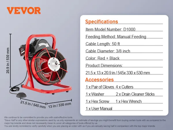 VEVOR Rioolreinigingsmachine 50 FT x 3/8 Inch, Rioolveer met Handmatige Aanvoer, 250 W Elektrische Rioolreinigingsmachine met 4 Snijmessen en Luchtgeactiveerde Voetschakelaar voor 2" tot 4" Buizen