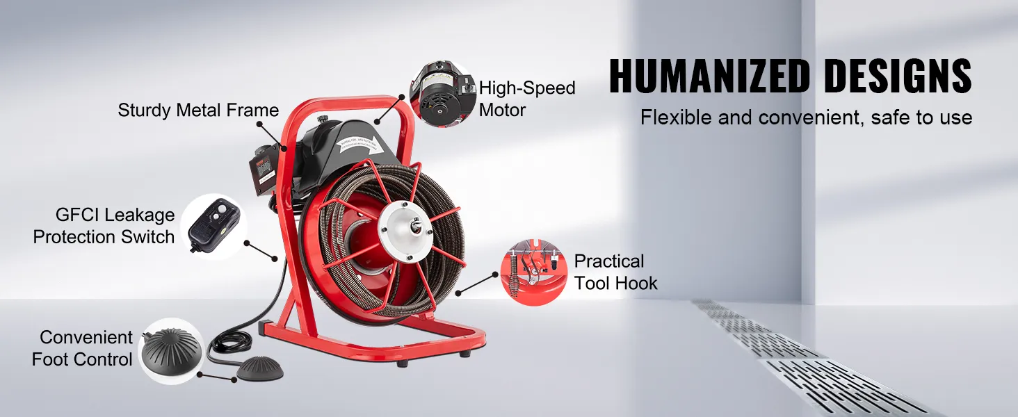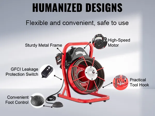 Deze pijpreinigingskabel heeft een compacte behuizing en een ergonomisch handvat. De CW/CCW-schakelaar en de luchtgeactiveerde voetschakelaar maken de bediening van het snoer eenvoudig, zodat u gemakkelijk verstoppingen in leidingen, afvoeren, gootstenen en toiletten kunt verwijderen.