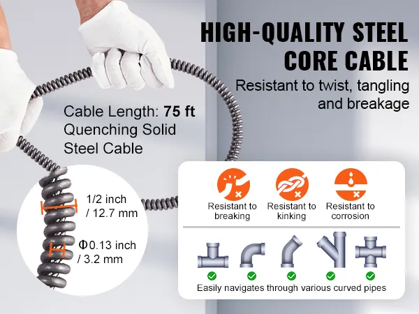 Premium kabel met stalen kern: onze kabel met stalen kern van 75ft x 1/2" / 22,86 m x 12,7 mm is ontworpen om breuk, torsie en corrosie te weerstaan en gemakkelijk door complexe gebogen buizen te bewegen. Het is ideaal voor buizen van 5 tot 10 cm en zorgt voor een soepel en efficiënt reinigingsproces.