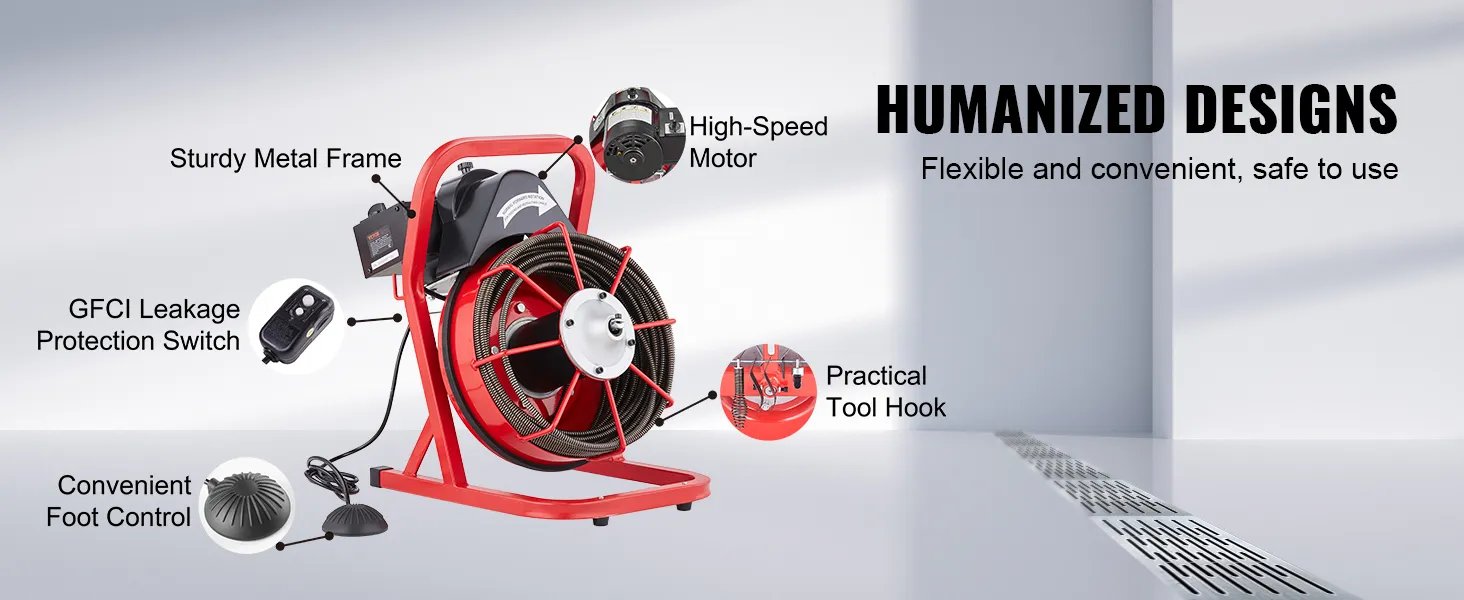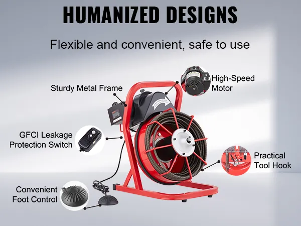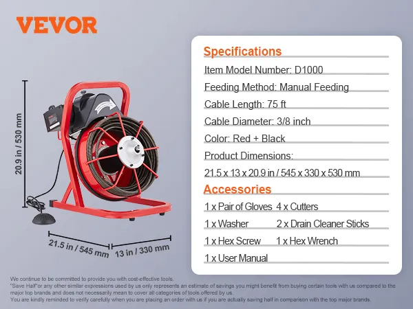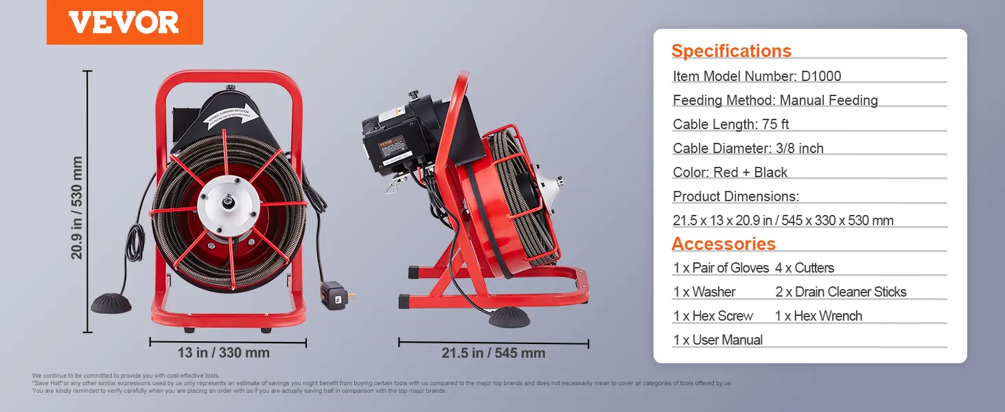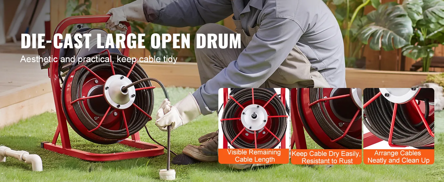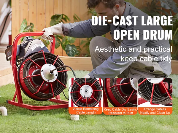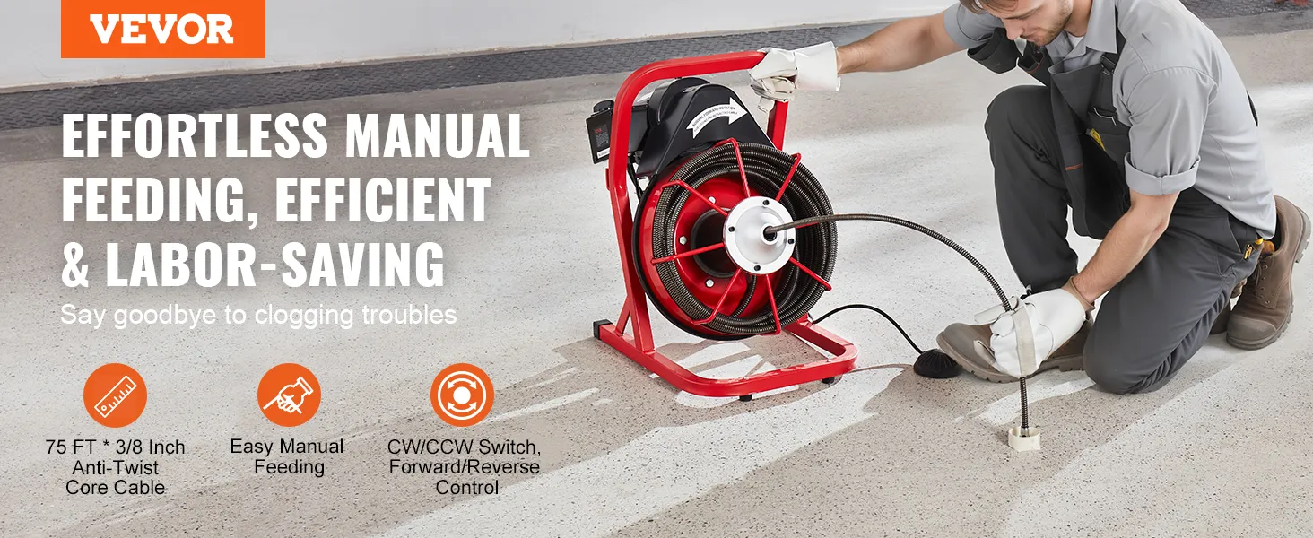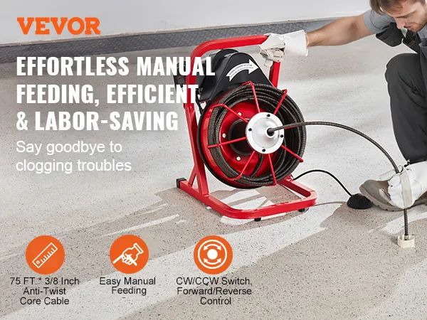 Zeg vaarwel tegen onaangename geuren en onderhoudsproblemen! Laat de VEVOR elektrische pijpreinigingsmachine met een massieve kernkabel van 22,86 m x 9,53 mm alle verstoppingsproblemen in één keer oplossen zonder zorgen!