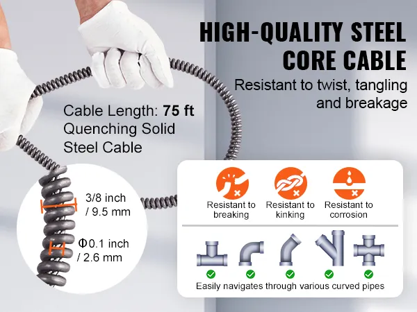 Premium stalen kernkabel: onze 75ft x 3/8" / 22,86 m x 9,53 mm stalen kernkabel is ontworpen om breuk, torsie en corrosie te weerstaan en gemakkelijk door complexe gebogen buizen te bewegen. Het is ideaal voor buizen van 5 tot 10 cm en zorgt voor een soepel en efficiënt reinigingsproces.