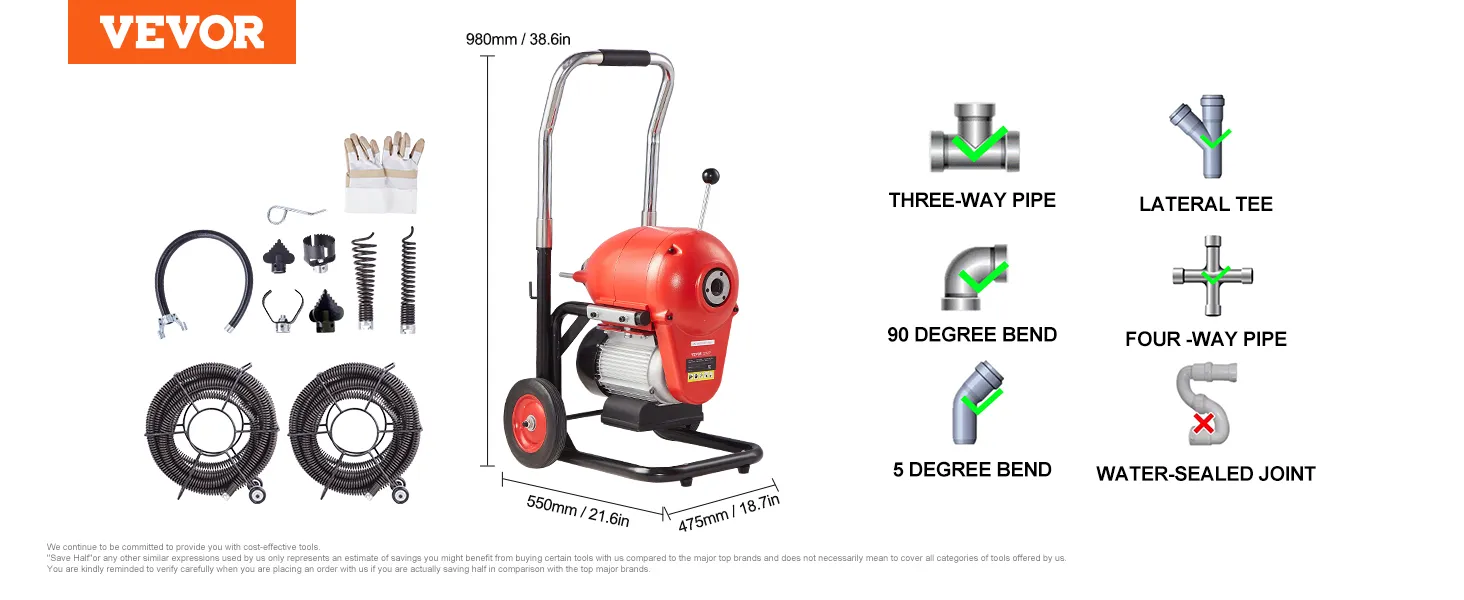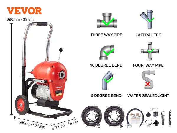 VEVOR Rioolreinigingsmachine 120 ft x 6/5 in, 1100 W Elektrische Rioolreinigingsmachine met handmatige invoer - met 6 snijmessen en CW/CCW-regeling voor buizen van 4" tot 8