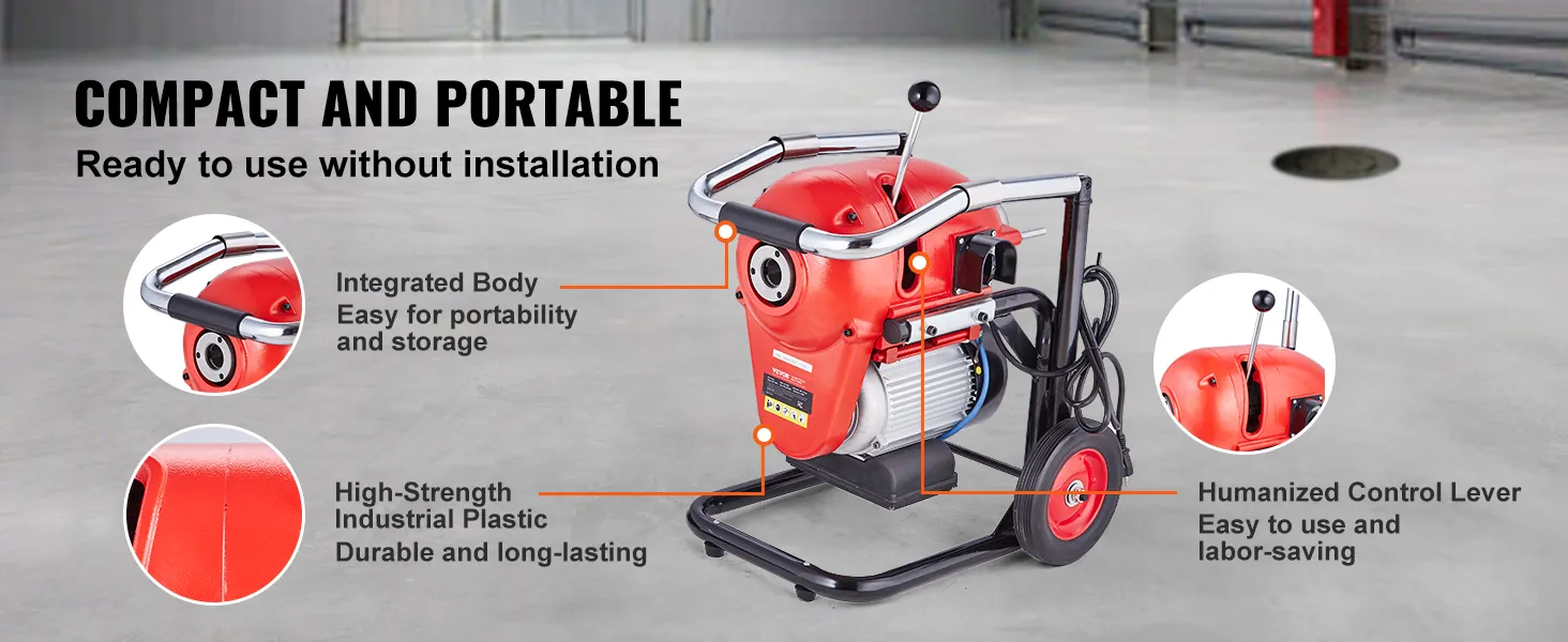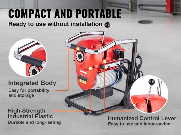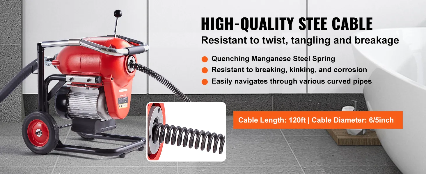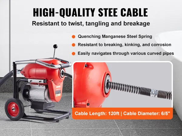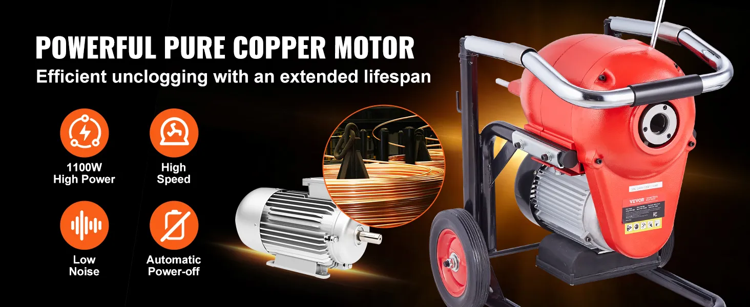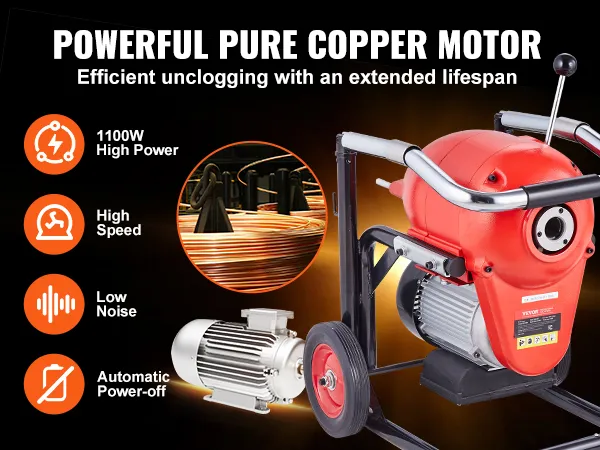 Uitgerust met een krachtige motor van 1100 W, werkt onze pijpreinigingskabel op hoge snelheid. De koperdraadmotor zorgt voor uitstekende geleiding, minimale weerstand en uitstekende efficiëntie, waardoor hardnekkige verstoppingen gemakkelijk worden geëlimineerd.