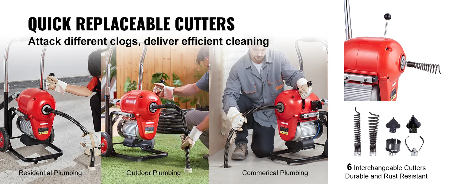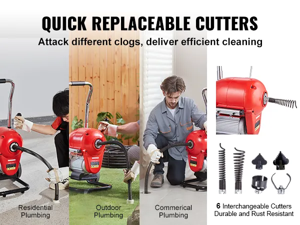 6 verwisselbare snijgereedschappen: de elektrische leidingreinigingskabel heeft 6 snel verwisselbare snijgereedschappen die perfect zijn voor het opruimen van verstoppingen in leidingen, vloerafvoeren, gootstenen en toiletten. Vereenvoudig het onderhoud en elimineer onaangename geuren - ideaal voor woningen, gebouwen en restaurants.