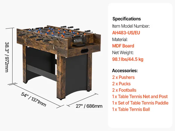 This 3-in-1 multi-function game table combines air hockey, foosball, and table tennis into one affordable table for hours of family fun. Its compact design (54x27x38.3 inch / 137x68.6x97 cm) and stack up structure save space effortlessly.