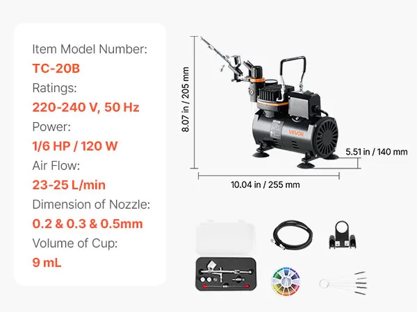 VEVOR Airbrush Set 1/6 HP met luchtcompressor en tank, 1 Dual Action Airbrush-pistool met 3 spuitmonden (0,2/0,3/0,5 mm) & slang & beugel & reinigingsset, voor taartdecoratie, modelschilderen en nail art