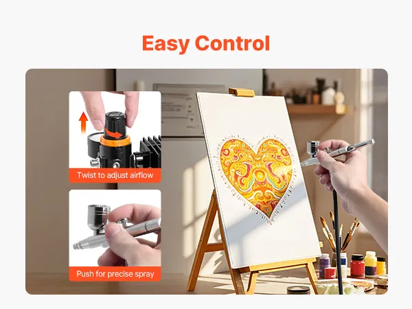 Eenvoudige bediening en gebruiksvriendelijk ontwerp voor beginners: deze airbrushset met compressor bevat een airbrush met dubbele werking voor onafhankelijke lucht- en verfregeling. De instelbare drukknop zorgt voor gelijkmatig spuiten, waardoor het zelfs voor beginners gemakkelijk is.