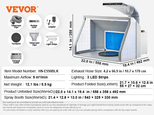 Efficient Filter Cotton & Detachable Turntable: The 0.79"/20mm thick filter cotton efficiently absorbs particles and odors. We also provide replacement filter cotton, making it easy to clean and maintain the paint spray booth's clean. The large turntable allows you to easily spray all angles of your item without moving it, ensuring even coating. It is also easy to remove and install, facilitating turntable cleaning.