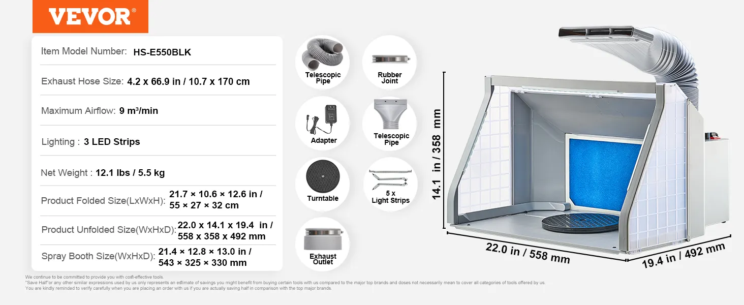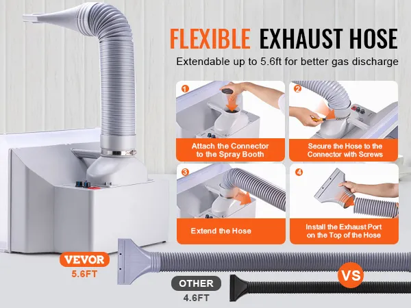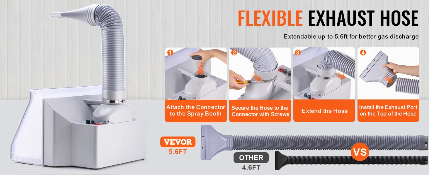 The hobby spray booth's exhaust hose can extend to 5.6ft, allowing particles and fumes to be fully vented away from you. The flexible design lets you extend, shorten, and bend the hose as needed, making it more adaptable for use in narrow working areas.