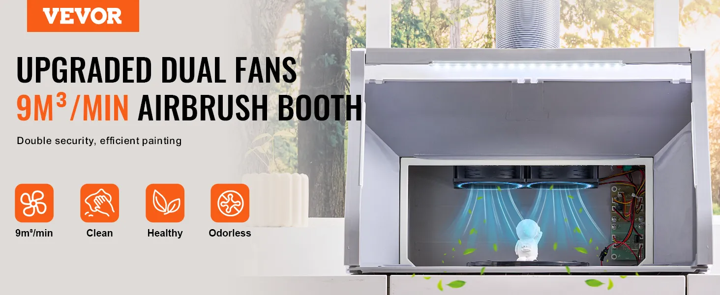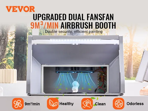 Strong Ventilation: The airbrush spray booth features high-efficiency dual exhaust fans paired with a 5.6ft flexible exhaust hose, delivering a powerful 9m³/min airflow. This ensures a clean working area by effectively removing paint fumes, dust, vapors, and other airborne particles. The excellent ventilation system helps maintain fresh indoor air, providing a healthier working environment.