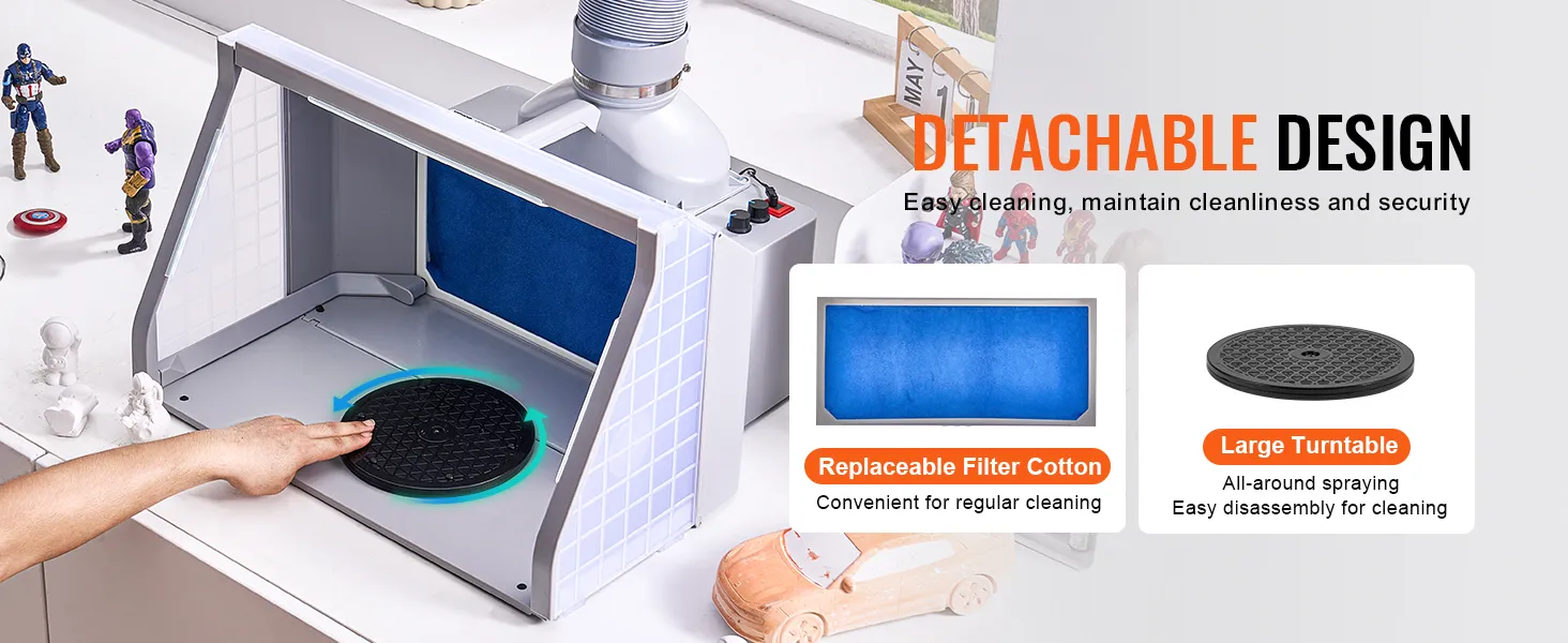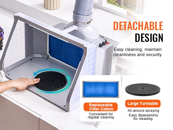 The large turntable allows you to place models or items on it for easy rotation and viewing from all sides. It can be detached anytime for cleaning. The spray booth for airbrushing includes the replacement filter cotton, which is easy to replace and helps maintain a clean spraying environment.