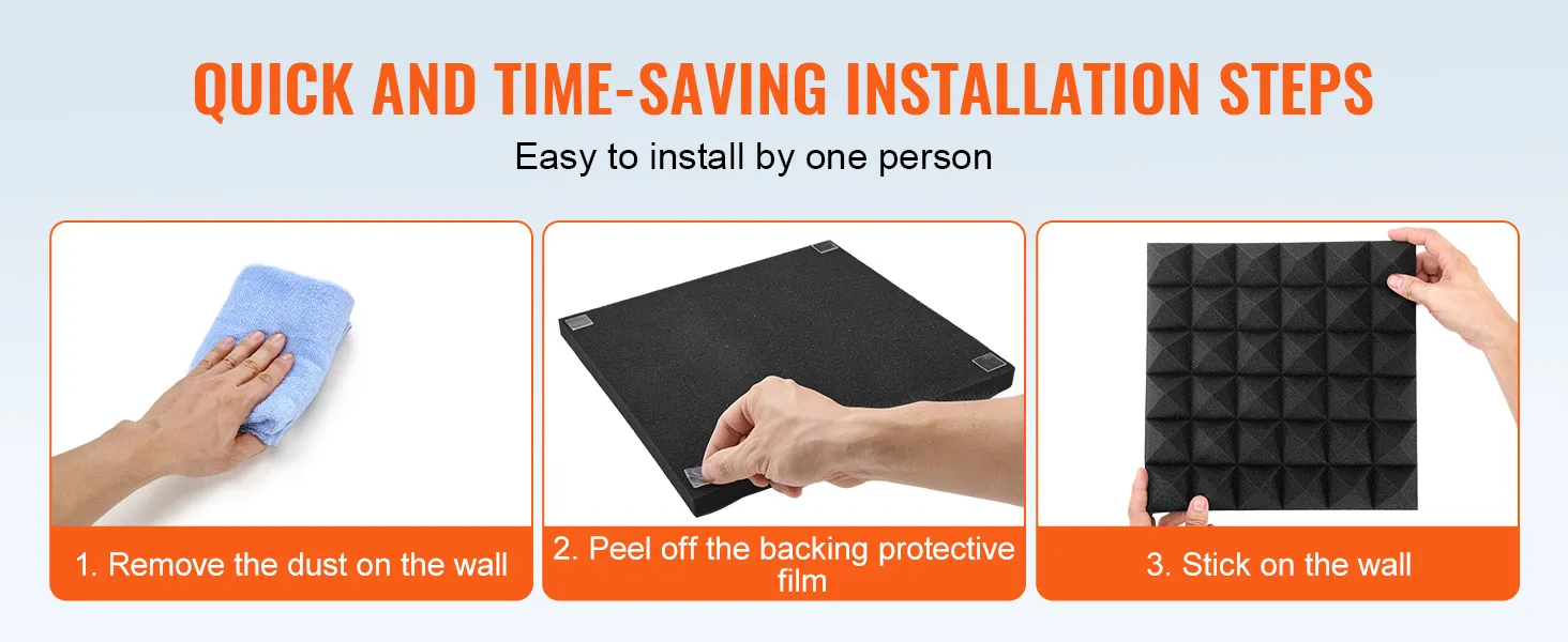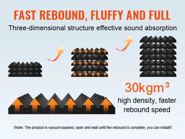 Efficient Soundproofing: The 30kg/m³ high-density polyurethane foam effectively absorbs high-frequency sound waves, improving the absorption of vibration echoes, reverberation, and noise, which helps reduce noise pollution and enhance sound clarity. NOTE: Vacuum packed. Please let it sit to regain shape. Feel free to contact customer service if you have any questions