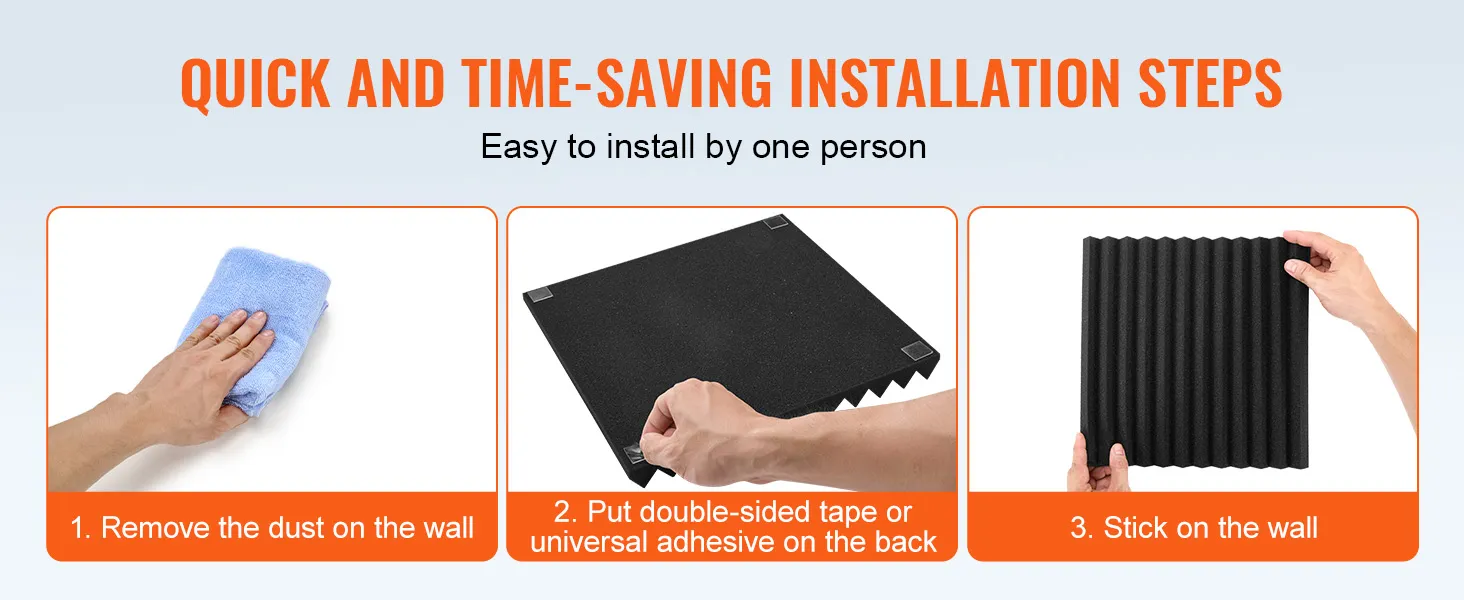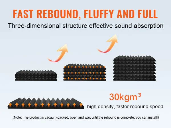 Efficient Soundproofing: The 30kg/m³ high-density polyurethane foam effectively absorbs high-frequency sound waves, improving the absorption of vibration echoes, reverberation, and noise, which helps reduce noise pollution and enhance sound clarity. NOTE: Vacuum packed. Please let it sit to regain shape. Feel free to contact customer service if you have any questions.