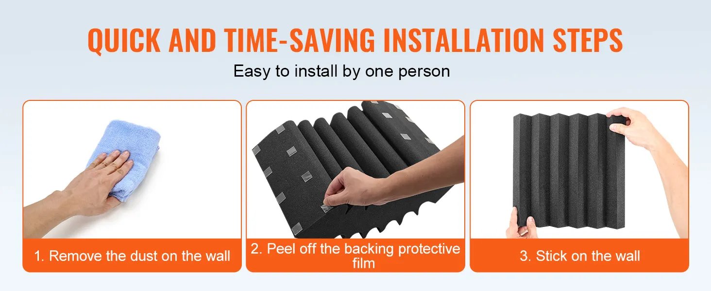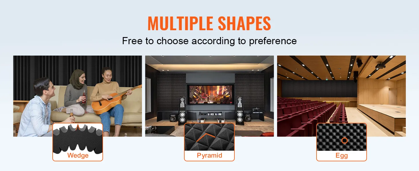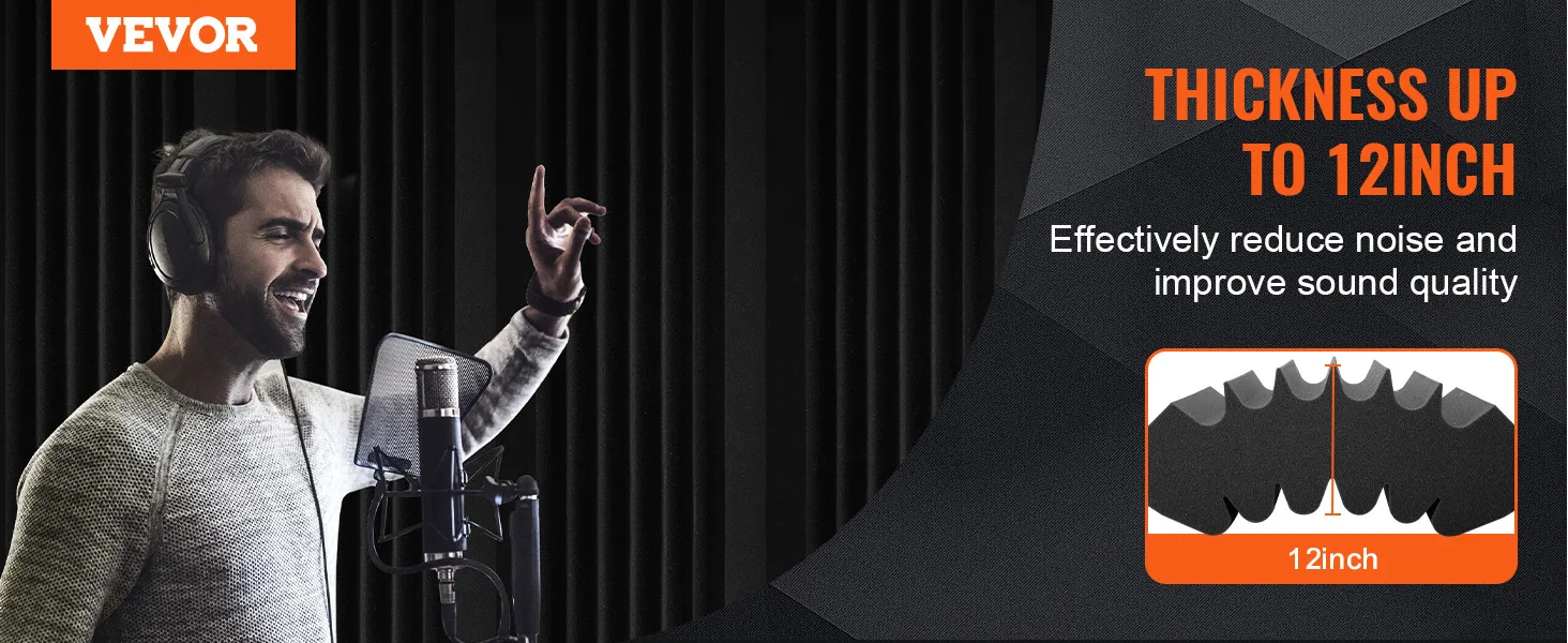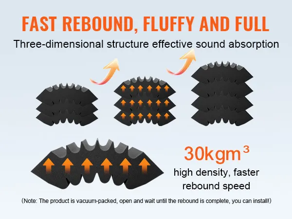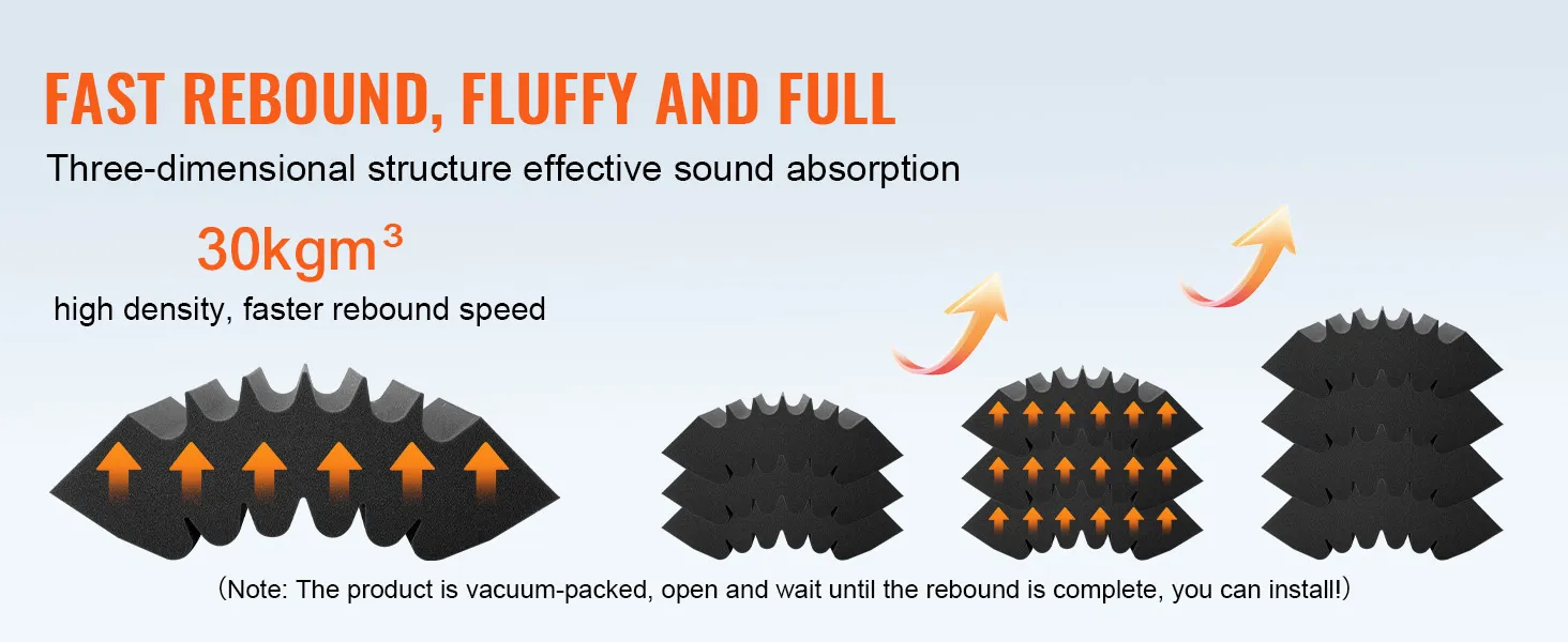 Efficient Soundproofing: The 30kg/m³ high-density polyurethane foam effectively absorbs high-frequency sound waves, improving the absorption of vibration echoes, reverberation, and noise, which helps reduce noise pollution and enhance sound clarity. NOTE: Vacuum packed. Please let it sit to regain shape. Feel free to contact our customer service if you have any questions