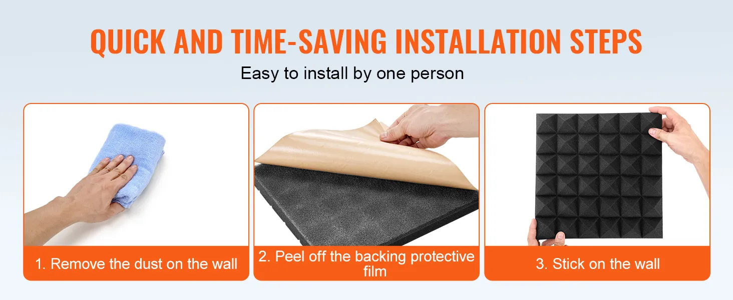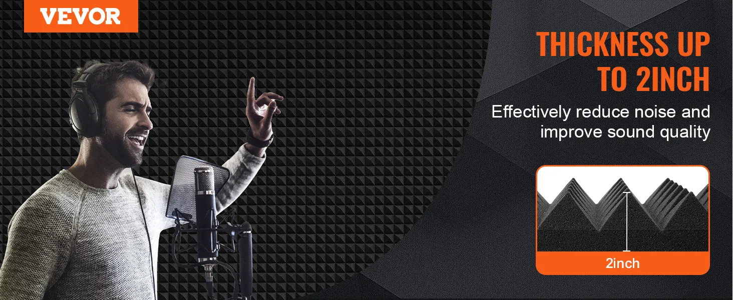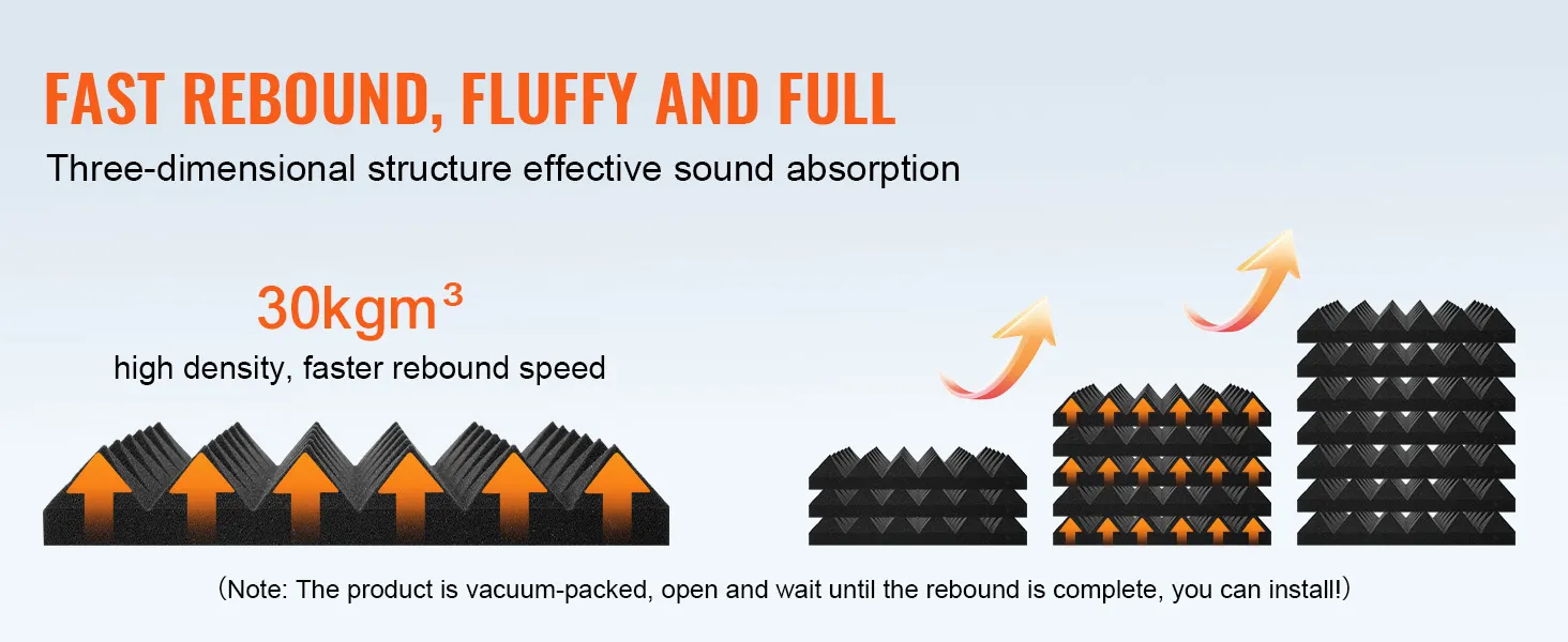 Efficient Soundproofing: The 30kg/m³ high-density polyurethane foam effectively absorbs high-frequency sound waves, improving the absorption of vibration echoes, reverberation, and noise, which helps reduce noise pollution and enhance sound clarity. NOTE: Vacuum packed. Please let it sit to regain shape. Feel free to contact our customer service if you have any questions