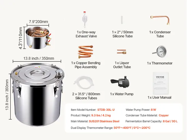8 Gal Distiller Kit: We provide a complete kit for this distiller, comprising a fermentation barrel, barrel lid, and cooling pot. The kit is made from food-grade materials including stainless steel, silicone, and copper, ensuring direct contact with ingredients. There are 3Gal, 5Gal, 8Gal, and 13.2Gal capacity fermentation barrels to choose from, perfect for gatherings with friends and family.