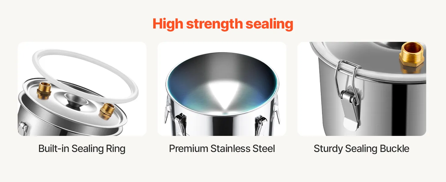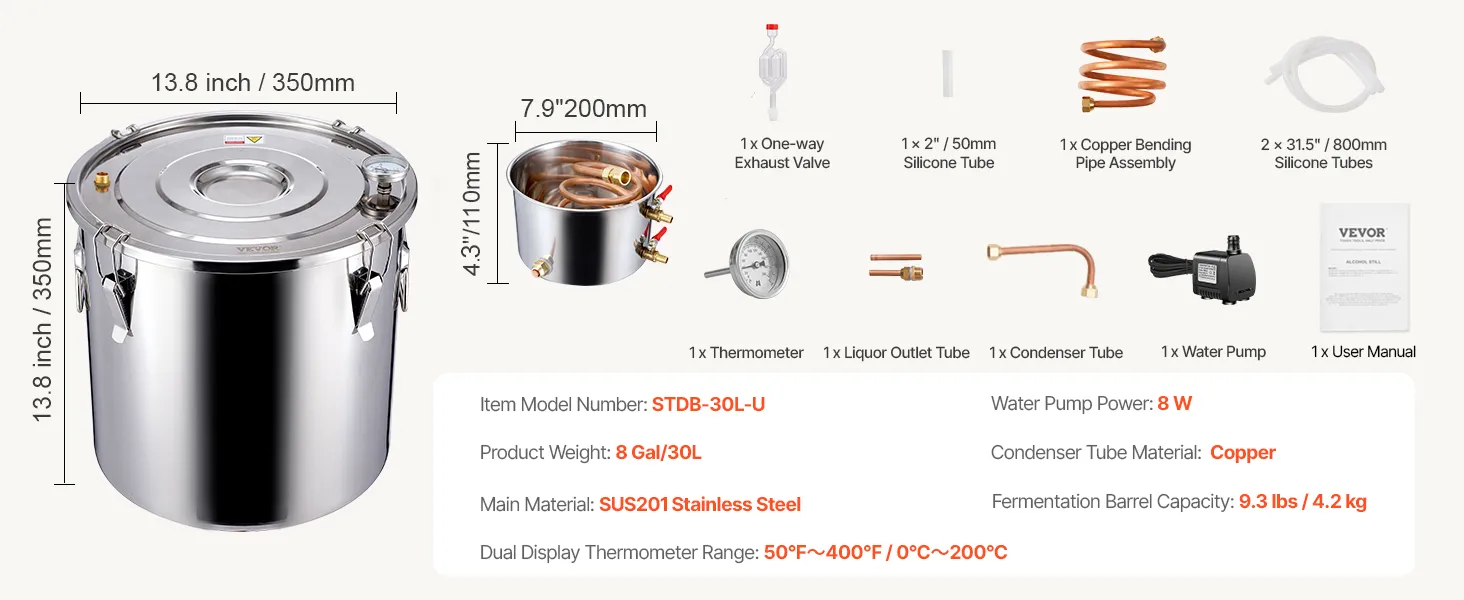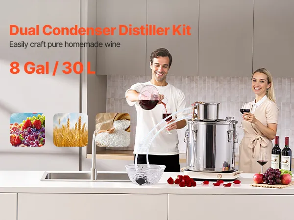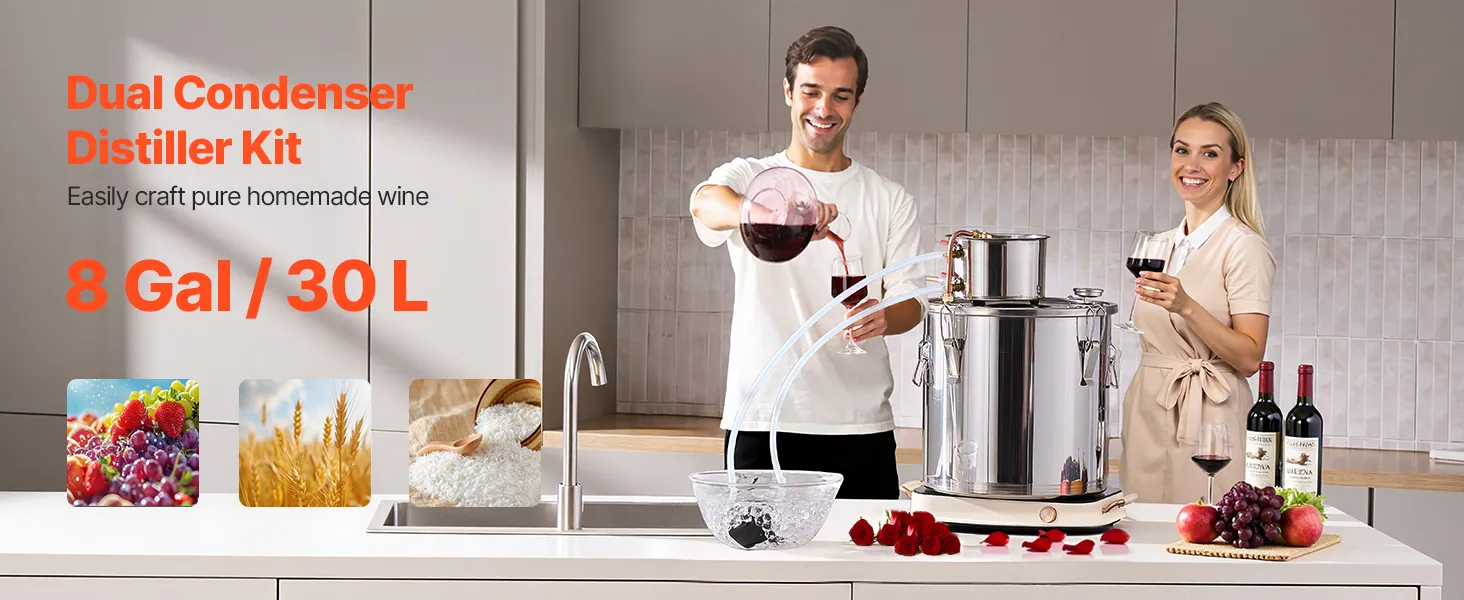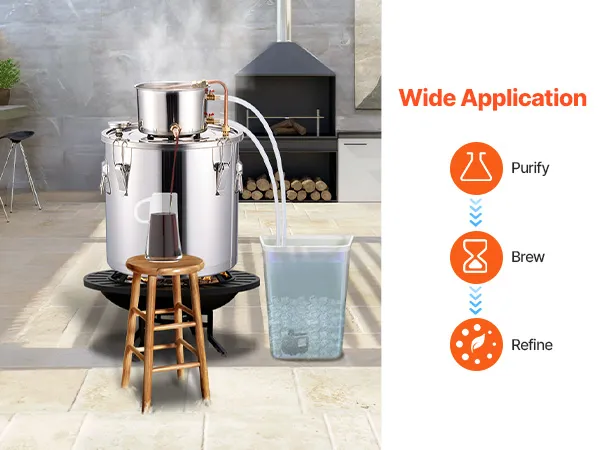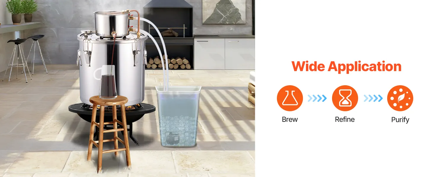 Sincerity and craftsmanship shine through! This distillation unit is perfect for beginners to brew and produce fruit wines, rum, vodka, distilled water, and other distilled products at home.