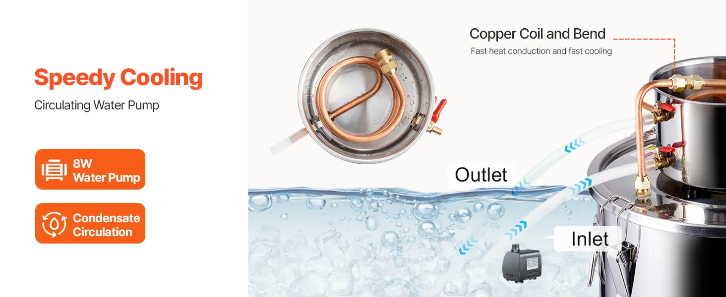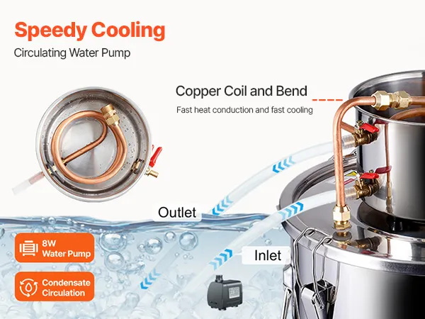 Quick and Efficient Cooling: The cooling and distillation process uses copper tube with good thermal conductivity to accelerate cooling. The smooth and wrinkle-free interior of the pipes prevents residues of distilled alcohol and water, ensuring no aftertaste. A water pump facilitates cooling water circulation for thorough and efficient cooling.