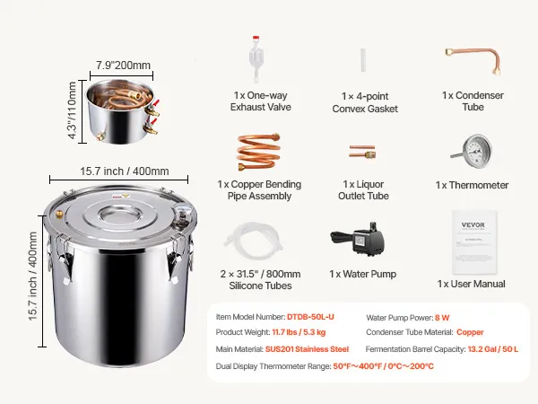Veilige fermentatie en verwarming: het fermentatievat is handig in gebruik. Een eenrichtingsaftapklep laat de gassen vrij die tijdens de fermentatie worden geproduceerd, waardoor de interne druk wordt verminderd. De verdikte roestvrijstalen basis is compatibel met verschillende verwarmingsmethoden, zoals houthaarden en gaskachels. Het temperatuurdisplay op het deksel toont de temperaturen in Celsius en Fahrenheit, waardoor het gemakkelijk is om de temperatuur tijdens de distillatie te controleren.