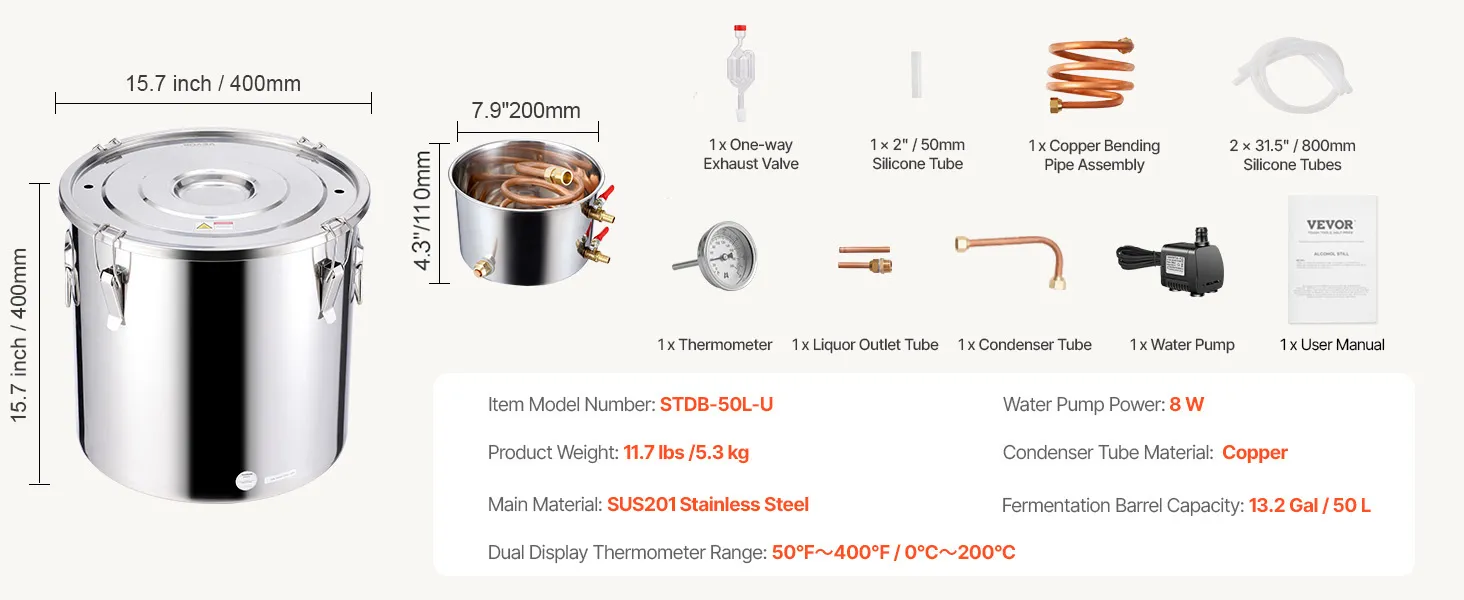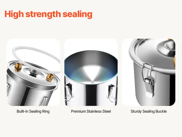 Deze destillatieset bevat een fermentatievat en een koelpot, beide gemaakt van roestvrij staal van voedingskwaliteit, waardoor veilig contact tijdens het brouw- en destillatieproces wordt gegarandeerd en het eindproduct veilig is om te drinken.