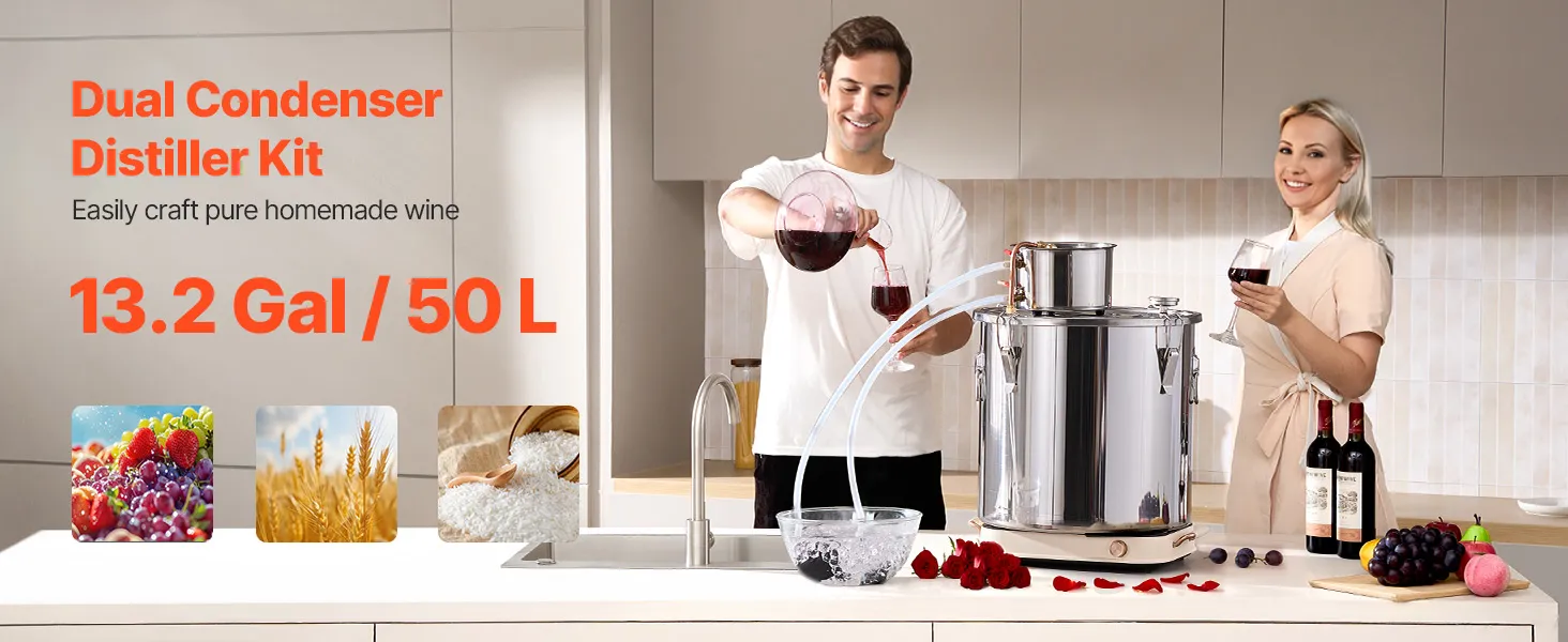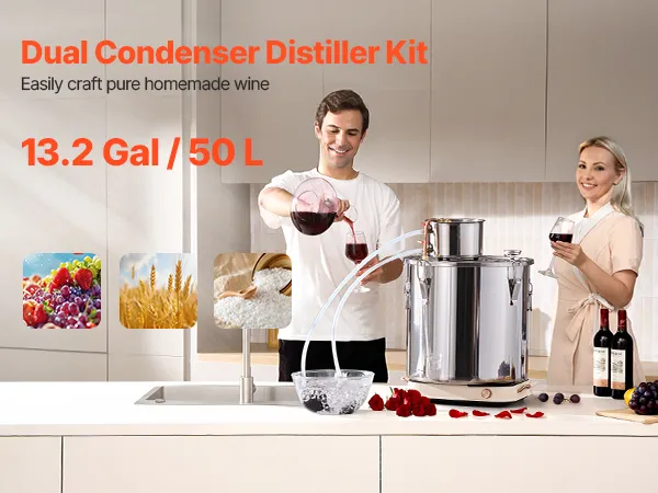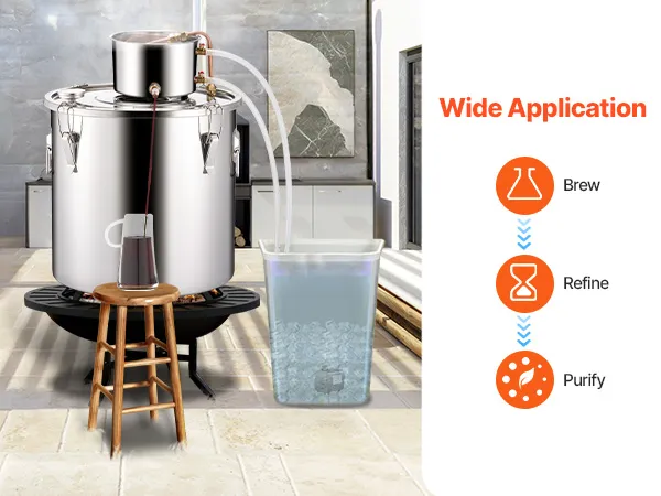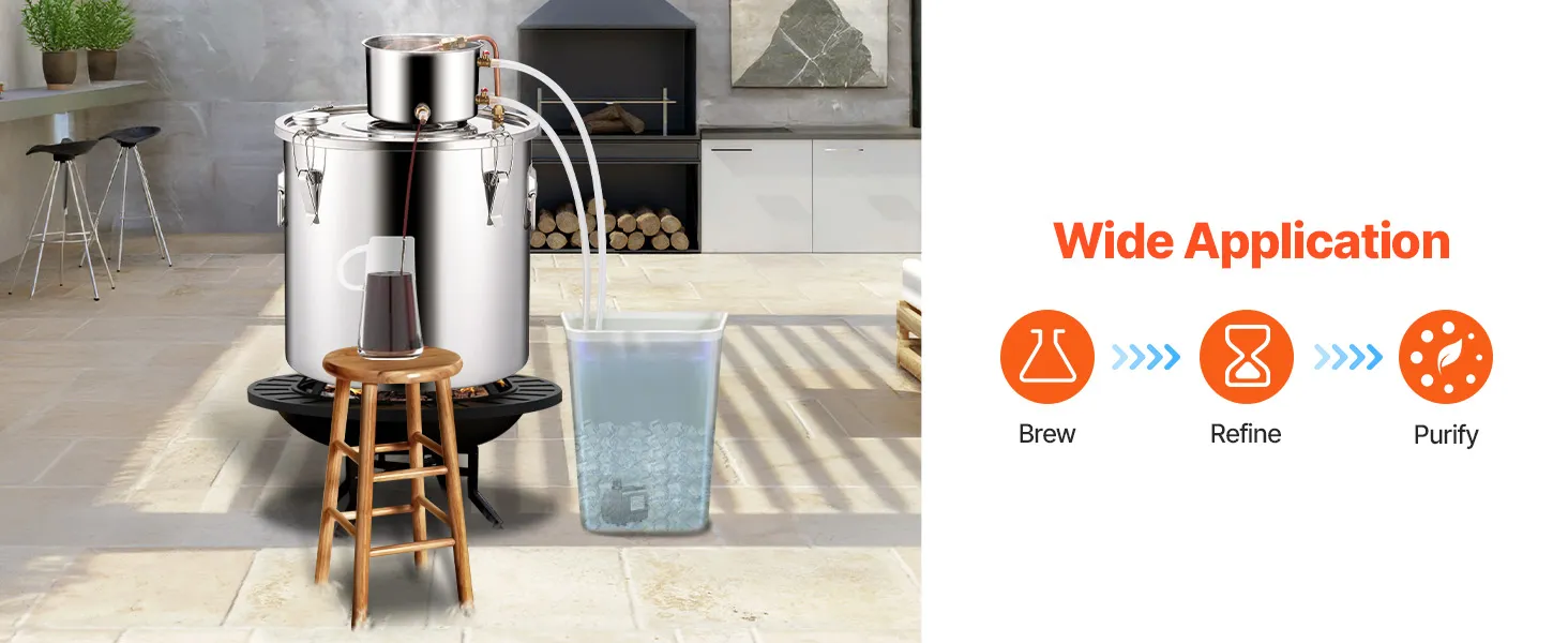 Brede toepassing: deze eenvoudige destillatie-eenheid is ideaal voor beginners om thuis fruitwijnen, rum, whisky, wodka, gedestilleerd water, bier, ethanol en andere gedistilleerde producten te brouwen en te produceren, waarmee u uw oprechtheid en vakmanschap op vakanties en bijeenkomsten demonstreert.