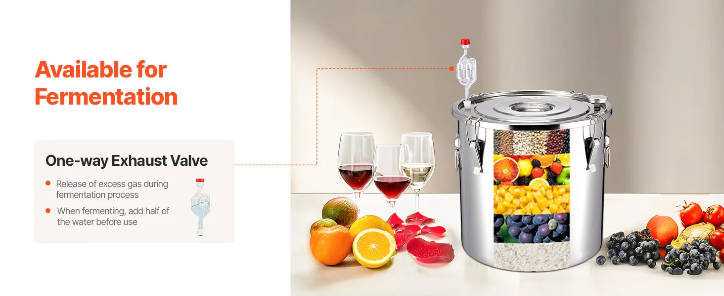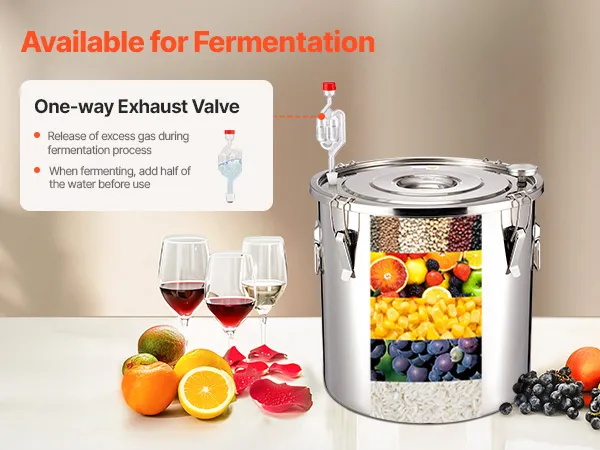 Uitlaatkleppen en temperatuurmeters helpen u het destillatieproces te stabiliseren en te controleren. Na de gisting kan dit vat direct gebruikt worden voor verwarming. Tip: Alcohol verdampt bij ongeveer 78°C, terwijl water in gefermenteerde producten verdampt bij 100°C.