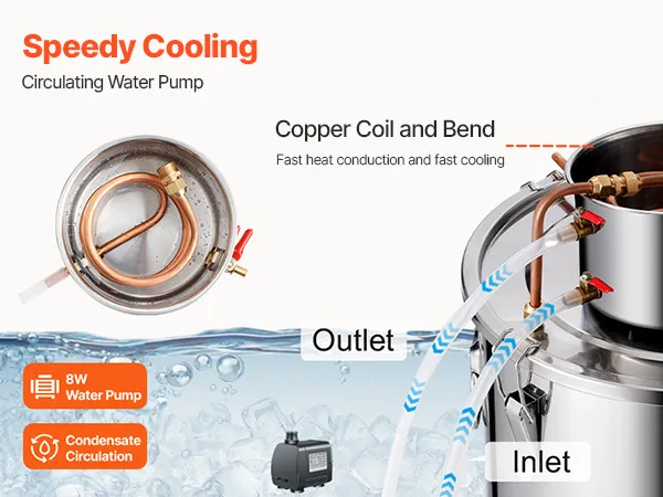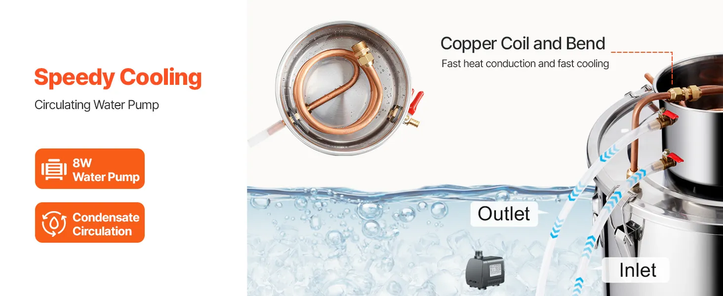 Snelle en efficiënte koeling: Het koel- en destillatieproces maakt gebruik van koperen leidingen met goede thermische geleidbaarheid om de koeling te versnellen. De gladde en kreukvrije binnenkant van de tubes voorkomt dat er resten van gedistilleerde alcohol en water achterblijven, waardoor er geen nasmaak ontstaat. Een waterpomp vergemakkelijkt de koelwatercirculatie voor een grondige en efficiënte koeling.