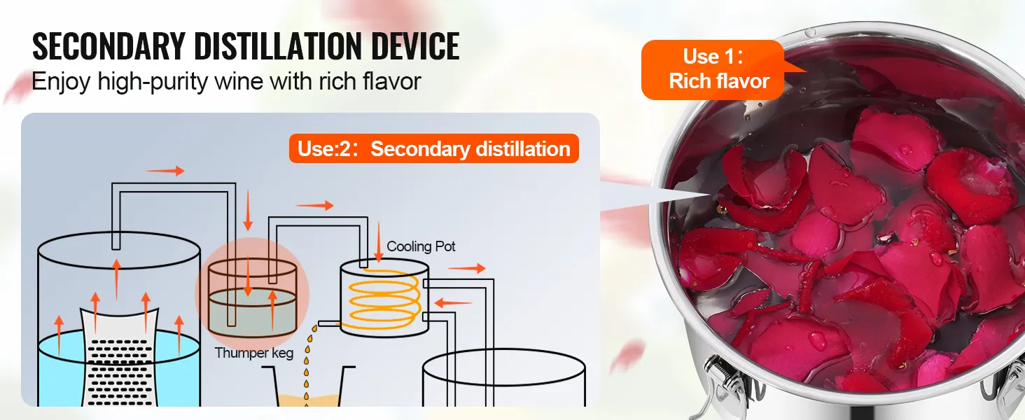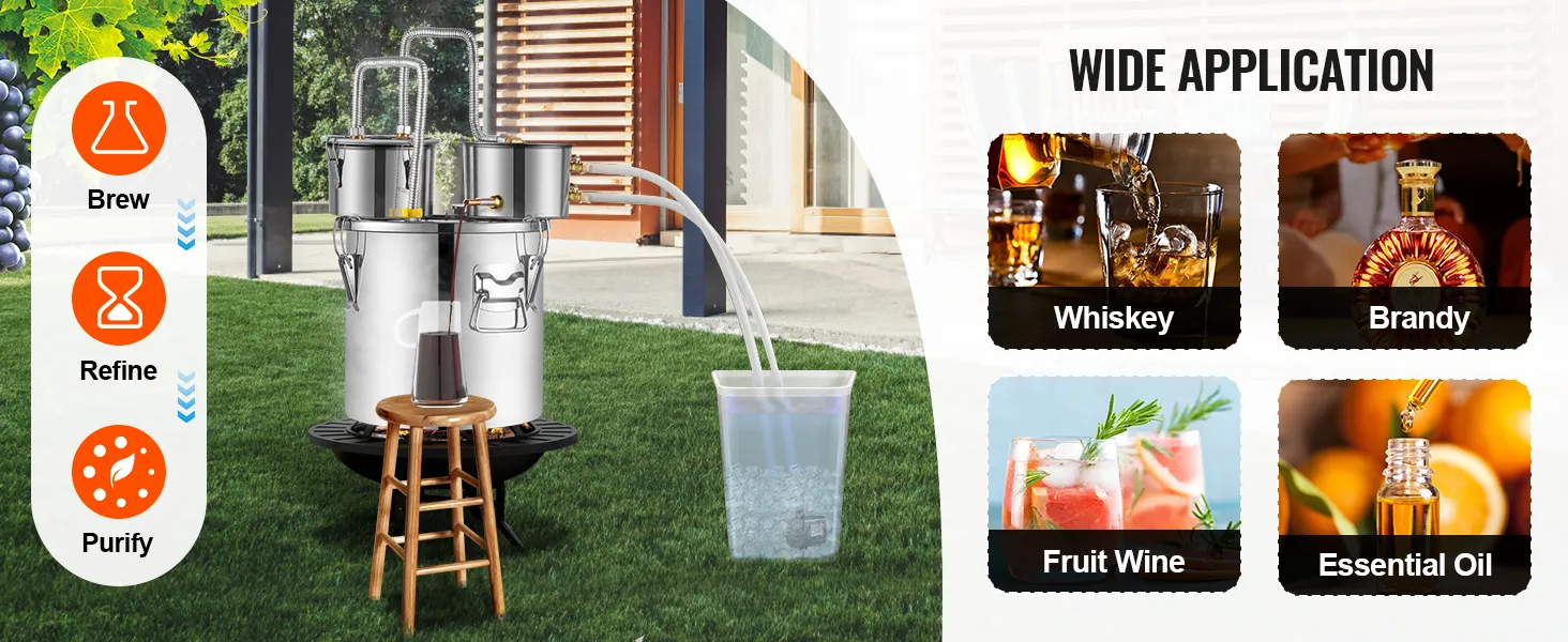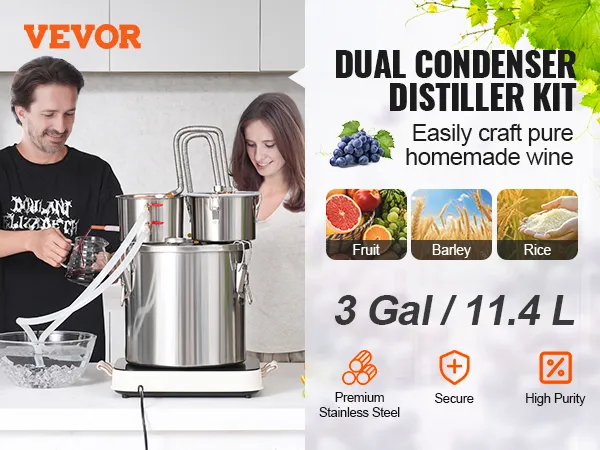 3Gal Dual Condenser Distiller Kit: We offer a complete kit for this flavor-enhancing distiller, ideal for brewing fruit wines, whiskies, brandies, champagnes, vodkas, water, ethanol, essential oils, and other distilled products at home. The main components include a fermentation barrel, barrel lid, cooling pot, and thumper keg. The fermentation barrel comes in multiple sizes: 3Gal, 5Gal, 8Gal, 13.2Gal, catering perfectly to family gatherings or parties with friends.