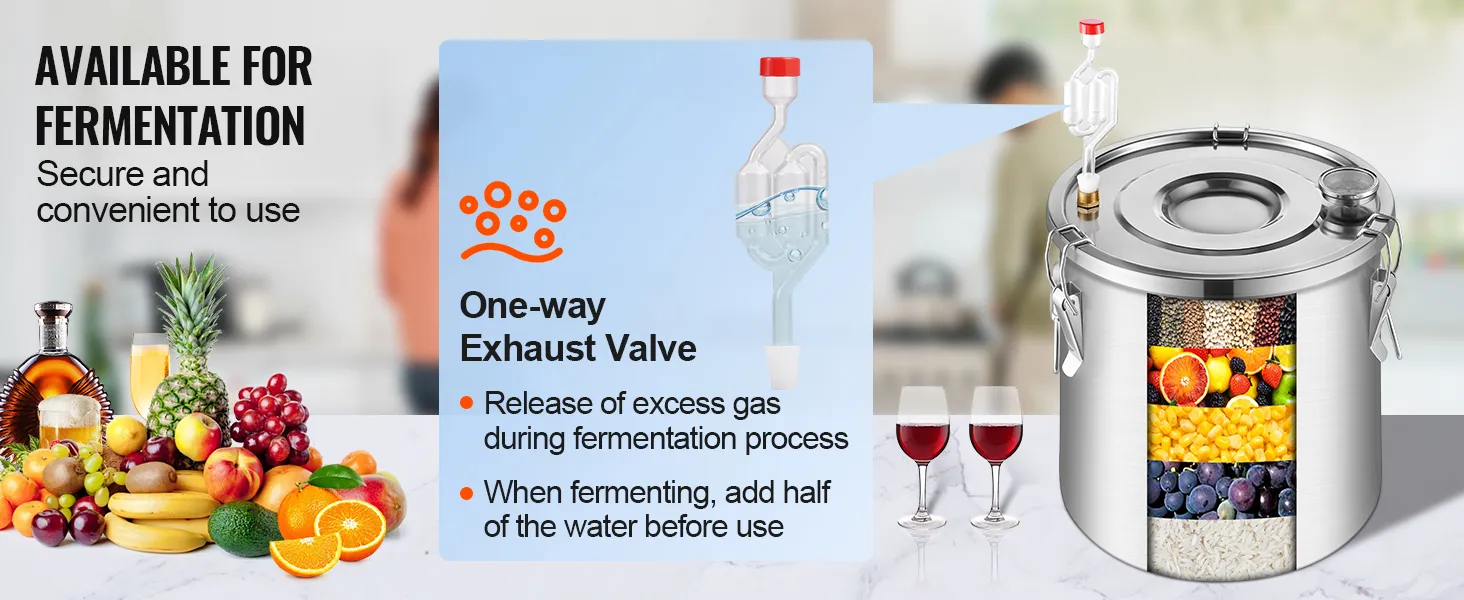 Secure Fermentation and Heating: The fermentation barrel is convenient to use. A unidirectional exhaust valve releases gases produced during fermentation, reducing internal pressure. The thickened stainless steel bottom is compatible with various heating methods such as wood fire, gas stoves, and gas stoves, preventing deformation and damage. The temperature gauge on the lid displays Celsius and Fahrenheit temperatures, facilitating temperature monitoring during distillation.