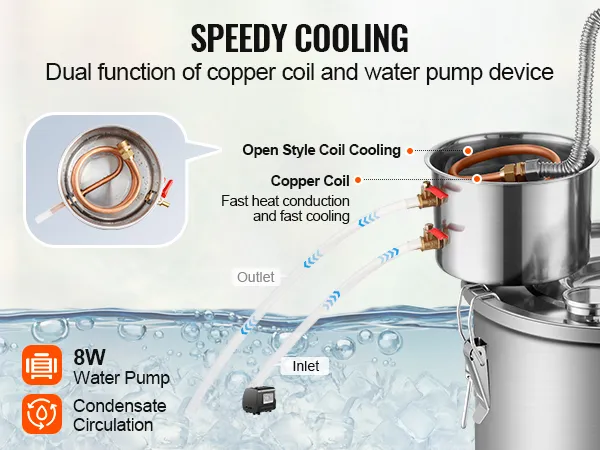 Quick and Efficient Cooling: With excellent thermal conductivity, the copper coils have a large contact area for accelerated cooling. The smooth and wrinkle-free interior of the pipes prevents residues of distilled alcohol, water, and essential oils, avoiding bacterial growth and ensuring no aftertaste. A water pump facilitates cooling water circulation, with inlet and outlet valves controlling flow rates for thorough and efficient cooling.