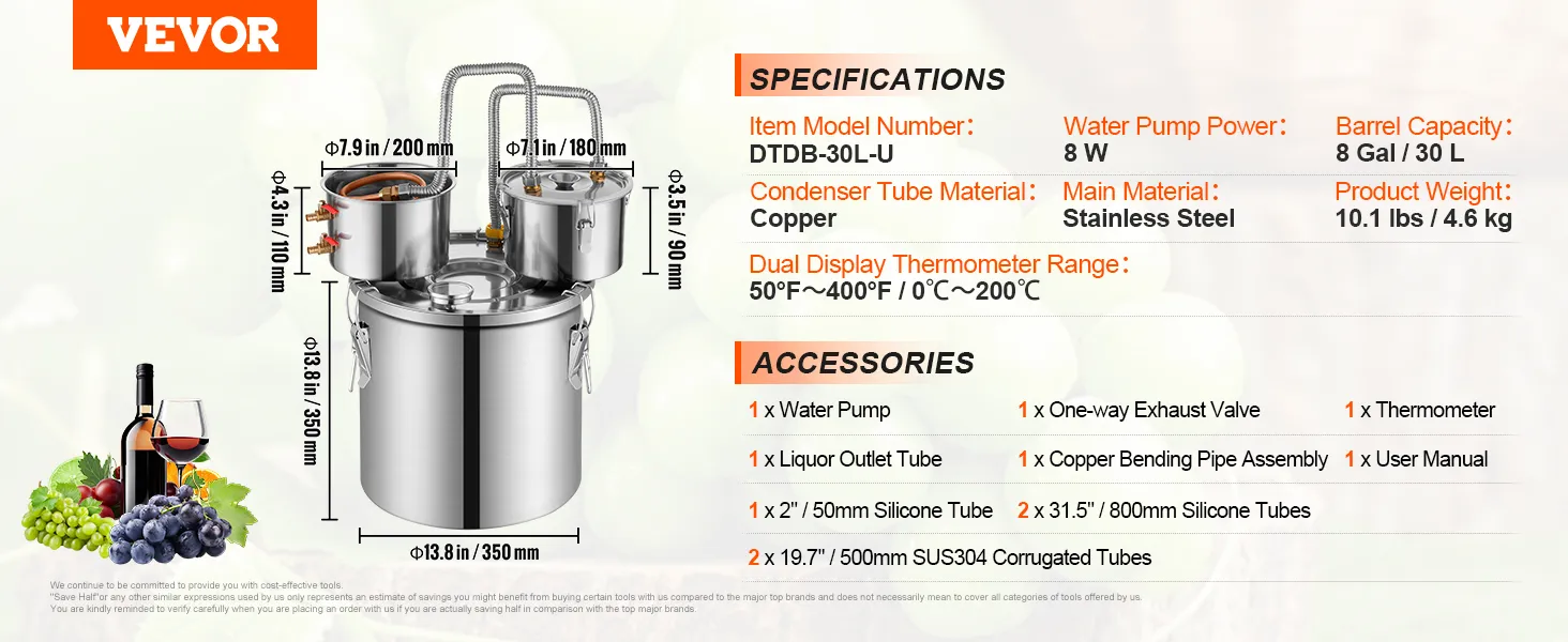 8Gal Dual Condenser Distiller Kit: We offer a complete kit for this flavor-enhancing distiller, ideal for brewing fruit wines, whiskies, brandies, champagnes, vodkas, water, ethanol, essential oils, and other distilled products at home. The main components include a fermentation barrel, barrel lid, cooling pot, and thumper keg. The fermentation barrel comes in multiple sizes: 3Gal, 5Gal, 8Gal, 13.2Gal, catering perfectly to family gatherings or parties with friends.