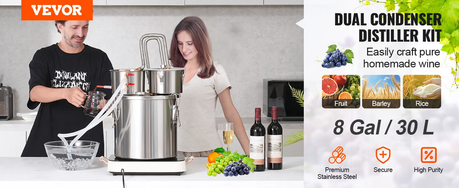 VEVOR Alcohol Still, 8 Gal / 30 L Stainless Steel Water Alcohol Distiller with Copper Coil for Fast Cooling, Dual Condenser Distiller Kit with Secondary Distillation, for Wine Whisky Brandy, Silver