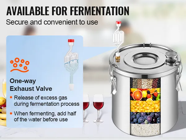 Secure Fermentation and Heating: The fermentation barrel is convenient to use. A unidirectional exhaust valve releases gases produced during fermentation, reducing internal pressure. The thickened stainless steel bottom is compatible with various heating methods such as wood fire, gas stoves, and gas stoves, preventing deformation and damage. The temperature gauge on the lid displays Celsius and Fahrenheit temperatures, facilitating temperature monitoring during distillation.