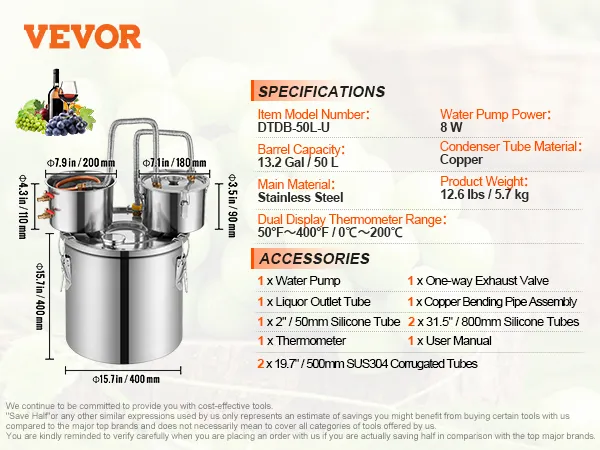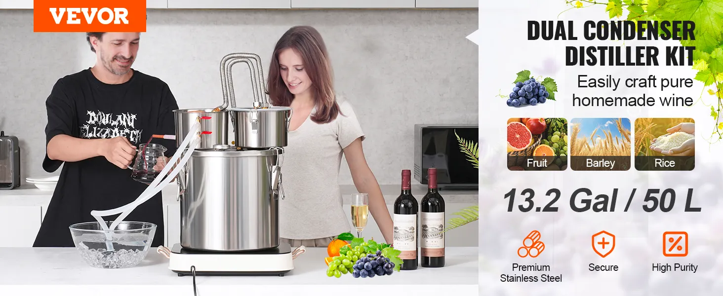 VEVOR Alcohol Distillatiesysteem Moonshine Still 50 L Water Alcohol Distillatiesysteem voor Snelle Koeling, Dubbele Condensator Distillatiekit met Secundaire Distillatie, voor Wijn Whisky Brandy Zilver
