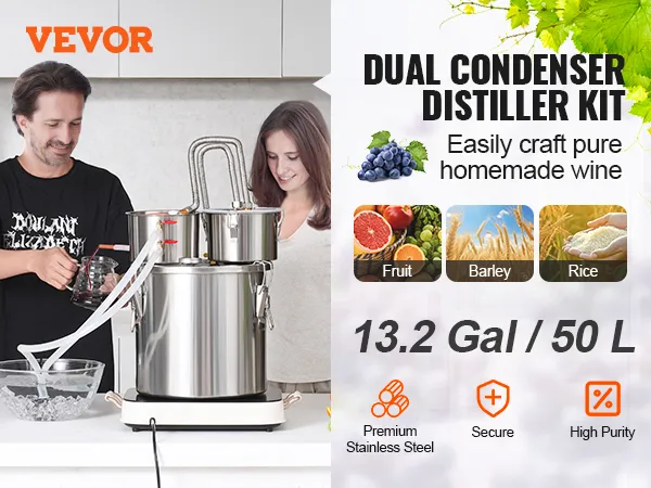 50L Dual Condenser Distiller Kit: Wij bieden een complete set voor deze smaakversterkende still, ideaal voor het thuis brouwen van fruitwijnen, whisky's, brandewijnen, champagnes, wodka's, water, ethanol, essentiële oliën en andere gedistilleerde producten. De belangrijkste componenten zijn onder meer een gistingsvat, een vatdeksel, een koelpot en een stampervat.