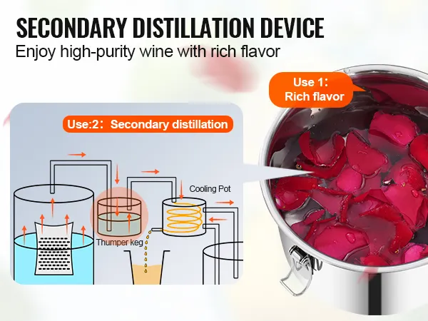 Secundair distillatiesysteem: In tegenstelling tot traditionele stills wordt er vóór de koelpot een stampervat toegevoegd, wat zuiverdere en rijkere smaken oplevert. Het thumper-vat verbetert de zuiverheid van de distillatie verder door secundaire destillatie te gebruiken om onzuiverheden in de alcoholdamp vloeibaar te maken en neer te slaan, waardoor high-proof whisky's of andere sterke dranken worden geproduceerd. Je kunt ook verschillende smaken toevoegen om de complexiteit van de afgewerkte wijn te vergroten.